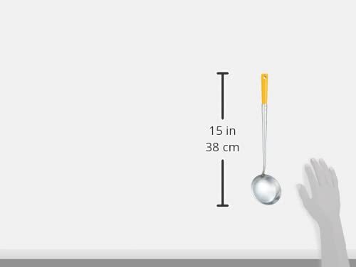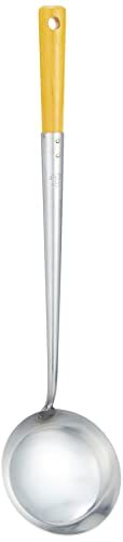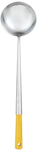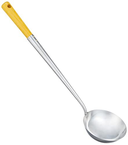 業務用・イエロー ATYA001・サイズ:直径95×柄長295mm・重量:130g・素材・材質:本体/18-0ステンレス ハンドル/天然木・原産国:日本・容量:約140cc説明 より ●家庭用サイズに合わせた中華料理の必須アイテム ●お手入れしやすいステンレス製