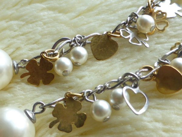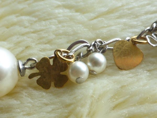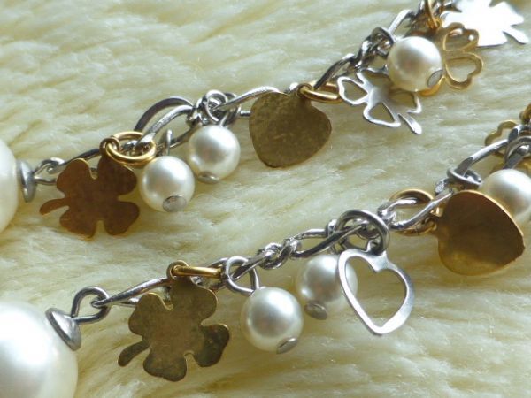 上のCOCOマークは約1cm×8mmほど  一番下の大きなパールは約1.2cm シルバークローバー・パール(直径約5mm)・ゴールドクローバ・シルバークローバー・パール・ゴールドハート・シルバーハート・パール・ゴールドクローバの順にチャームが下がっております。