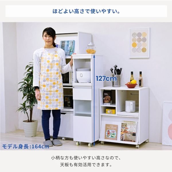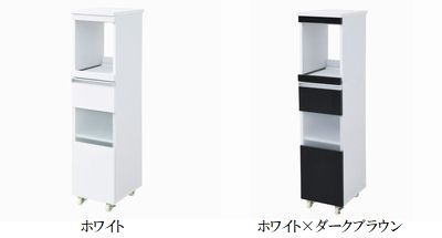 家電の収納に便利なコンセント付きスライド棚と、収納物に合わせて高さ調節ができる可動棚付きのラックをこれ1台で。 ハイタイプは収納量も抜群。 キッチンのちょっとした隙間に設置すれば、それまでのデッドスペースを有効活用できます。 |