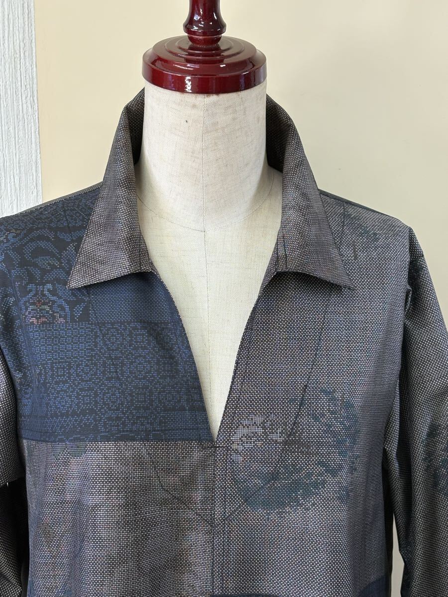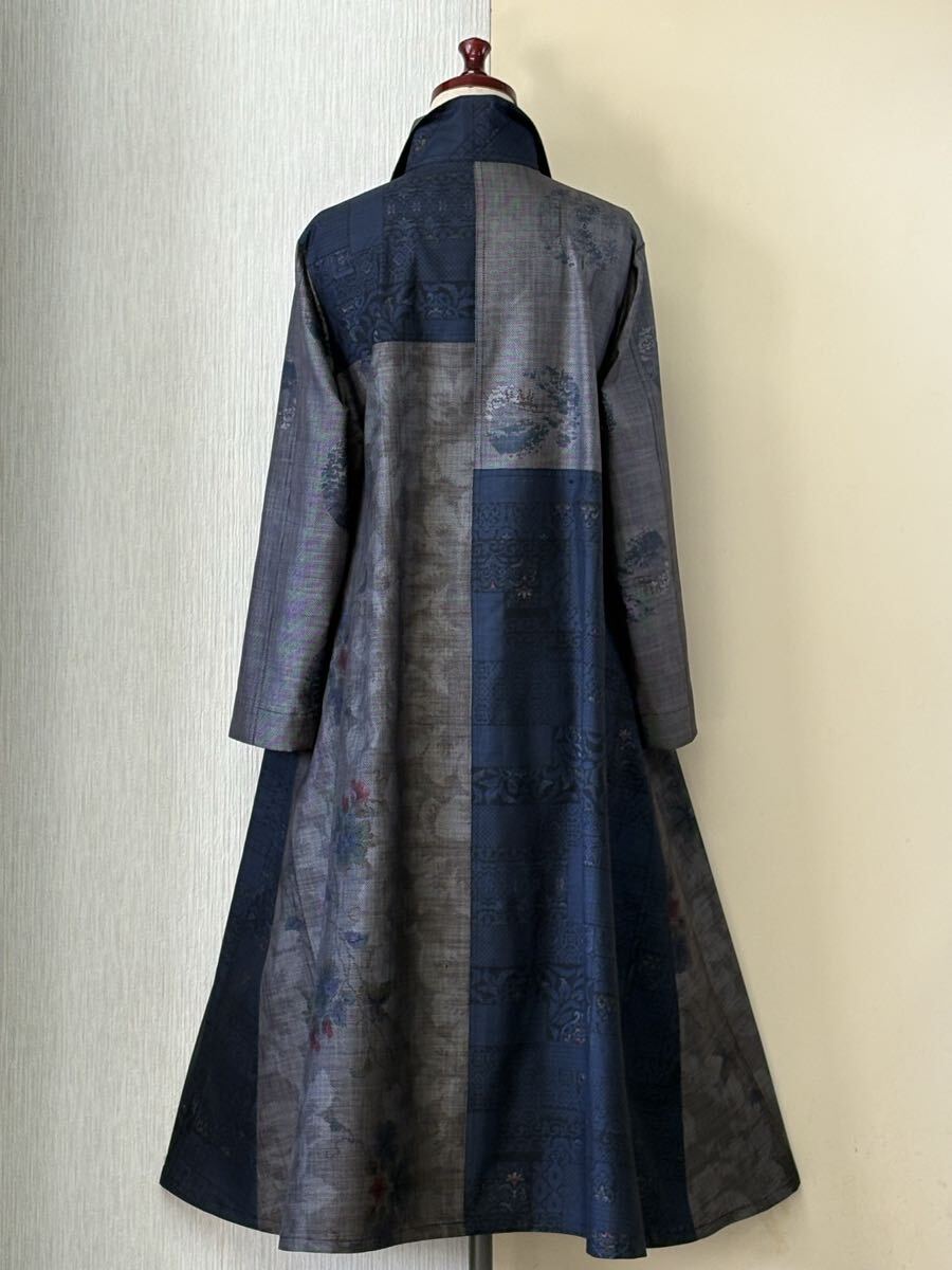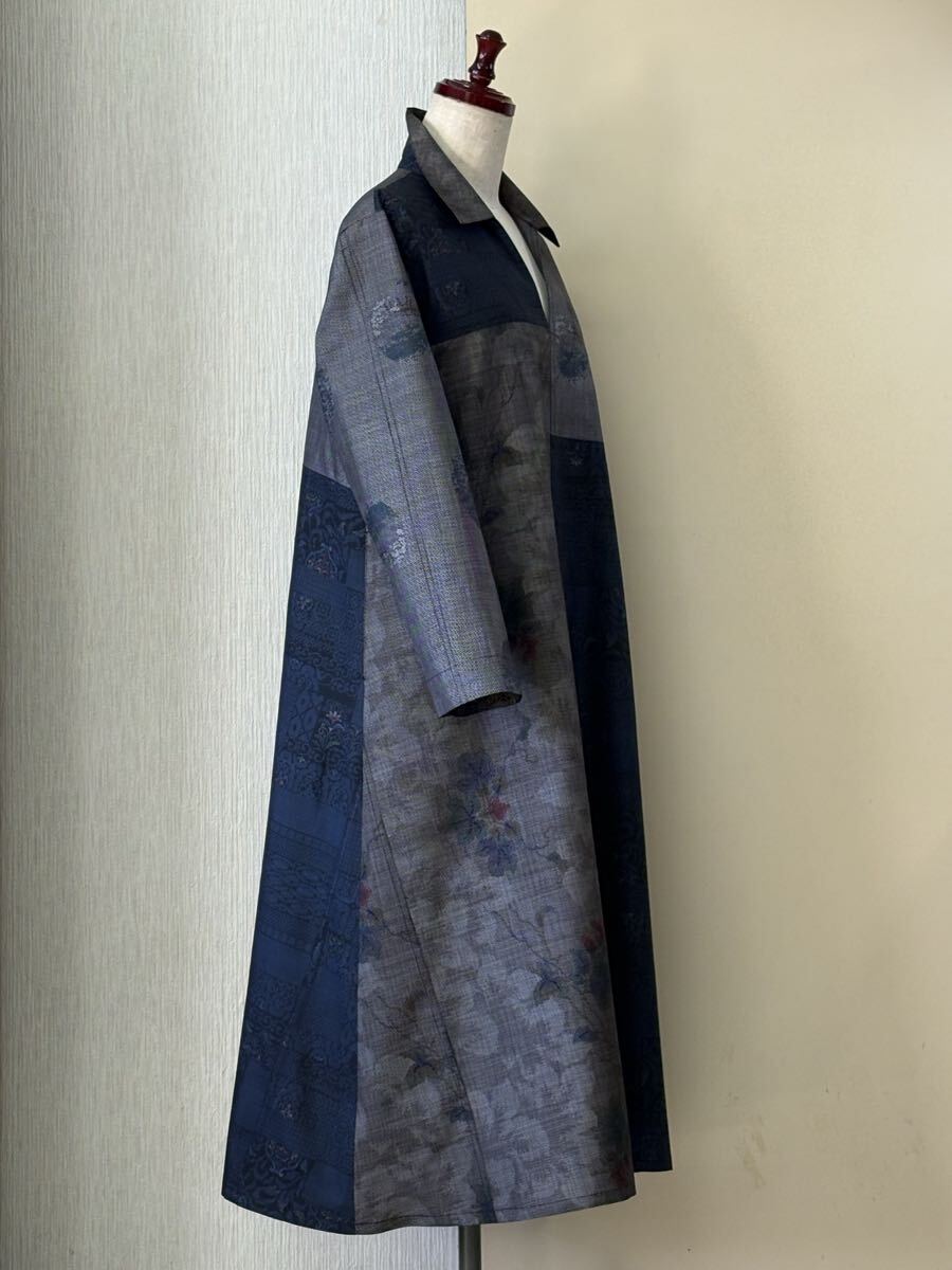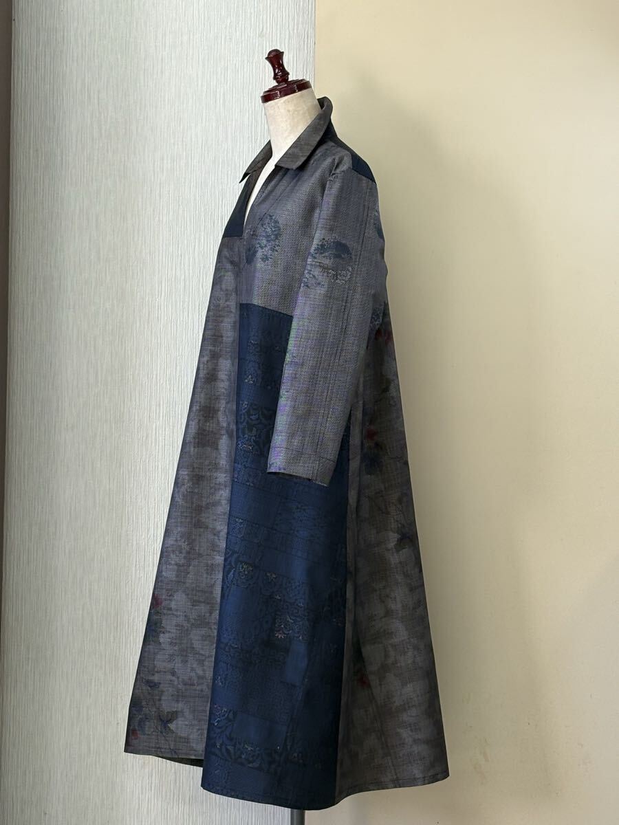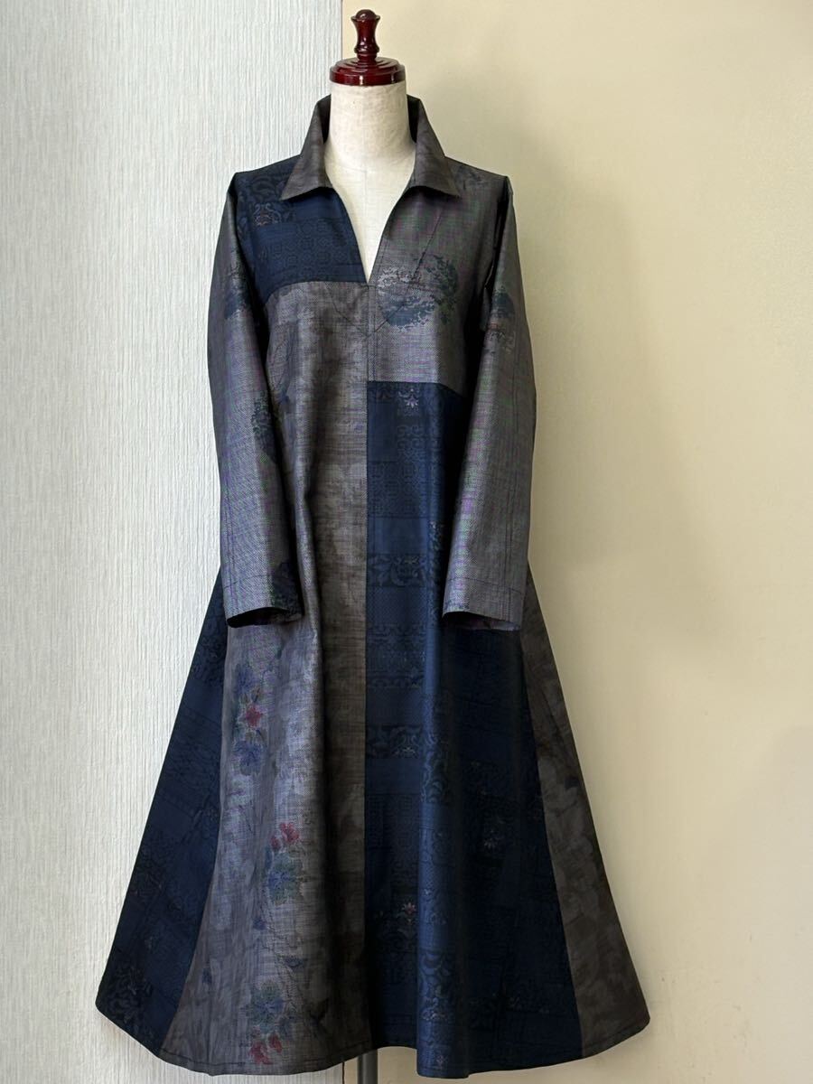 ★正絹、本場大島紬(純泥染め)3種類をパッチワークして「シャツカラー、ロングフレアーワンピース」を作りました。