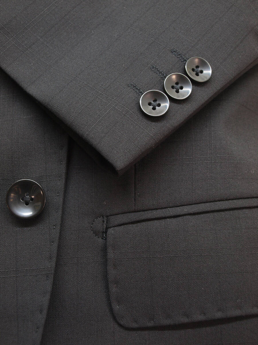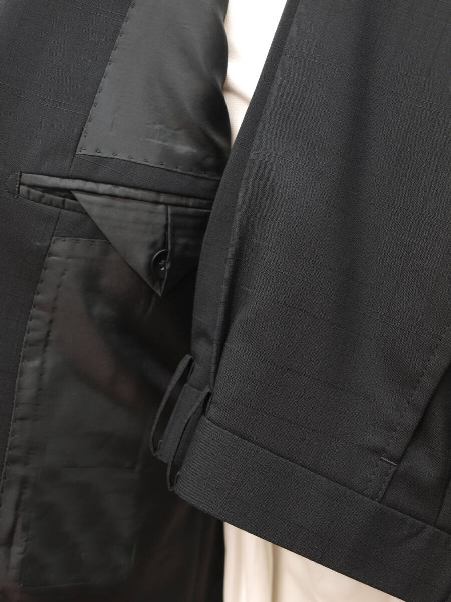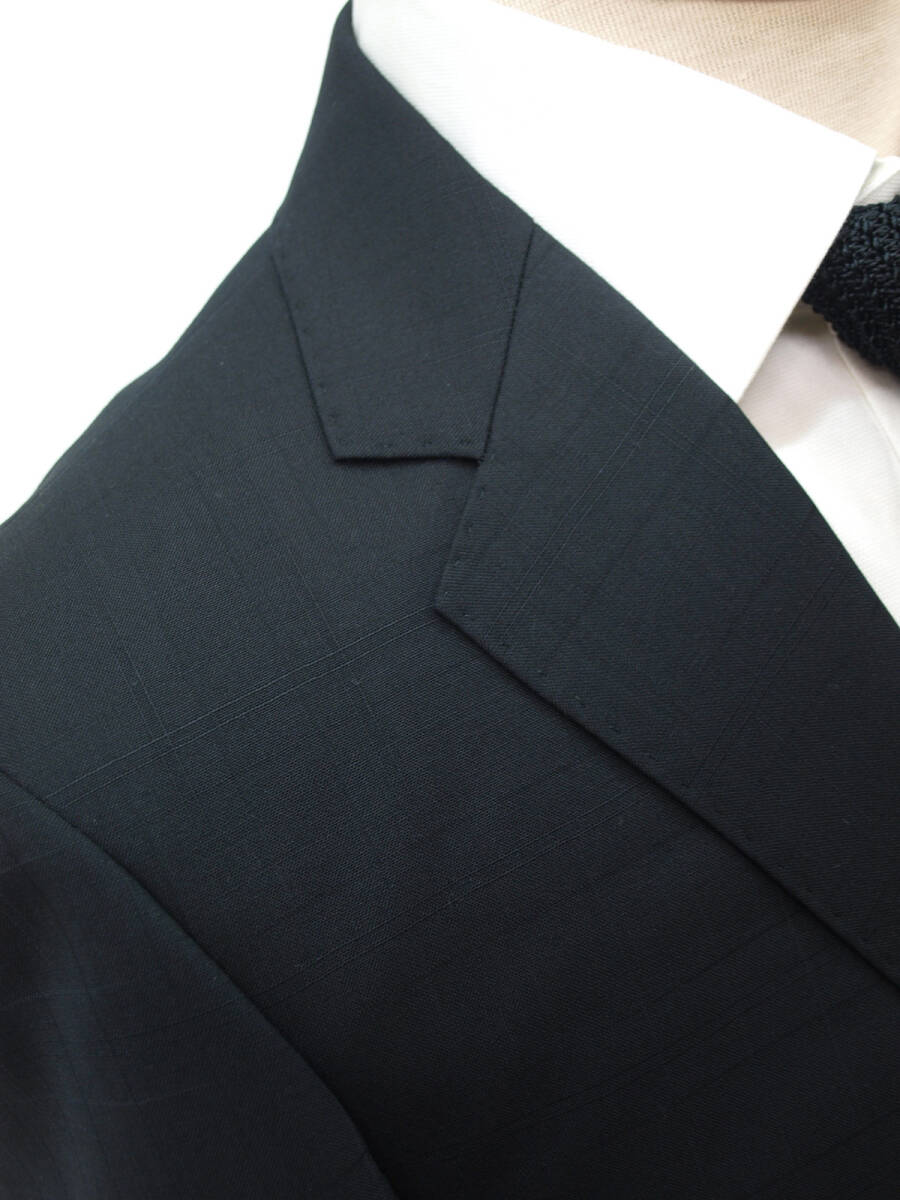 不良点 こちらの商品は生地不良となりあまり目立ちませんがシワがはいったようなラインの染不良が部分的にはいっておりますことをご了承下さい。各サイズ出品致しておりますが商品によって個体差がございます。 【サイズ】 K6 (KL号サイズ相当) 目安の体型 身長170cm~180cm、ウエストサイズ110 cm前後 【ジャケット実寸】 肩幅52cm 着丈74.5cm 袖丈60.5cm 脇下部分62cm 身幅61cm 【パンツ実寸】 ウエスト(胴回り実寸)110cm わたり幅39cm(股下10cmの部位で35.5cm) 裾幅24cm 脇股上30cm 前股上33.5cm 股下92cm(裾上げ未処理の状態/新品) 【素材】 表地:ウール100% 裏地:胴裏/キュプラ55% ポリエステル45% 袖裏/キュプラ55% ポリエステル45% 春夏向け紳士スーツ用、ニュージーランドメリノウール生地を使用 【色】 黒 【柄】 シャドウコードチェック柄 ・春先~夏~秋にかけて春夏メインのシーズン対応商品です。 【デザイン】 コンパクトな印象の細身ですっきりとしたシルエット、タイトフィットスリム、ビジネススーツ新品、裾上げしていない状態です。 ・ジャケット:段返りシングル3つボタンで細身のスリムモデル ・パンツ:細めシルエットのショートタックスリムパンツ 【縫製仕様】 ・ジャケットは一番上のボタンをかけずに着用する段返りシングル3つボタン、ノッチドラペル、襟縁等AMFステッチ入り、袖口ボタン3つ、サイドベンツ、内ポケット4つ(小ポケット2つ含む)、背抜き(春夏物) ・パンツはワンタック(ショートタック)、膝裏当て付き、脇ポケット斜め付け、後ろポケット両玉縁で左のみボタン付き、フロントはファスナーでボタン&ホック仕様、うちかけけボタン有り きちんとしたビジネス仕様の縫製仕立てで仕上がっております。