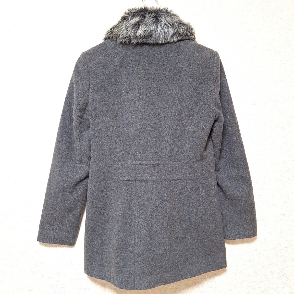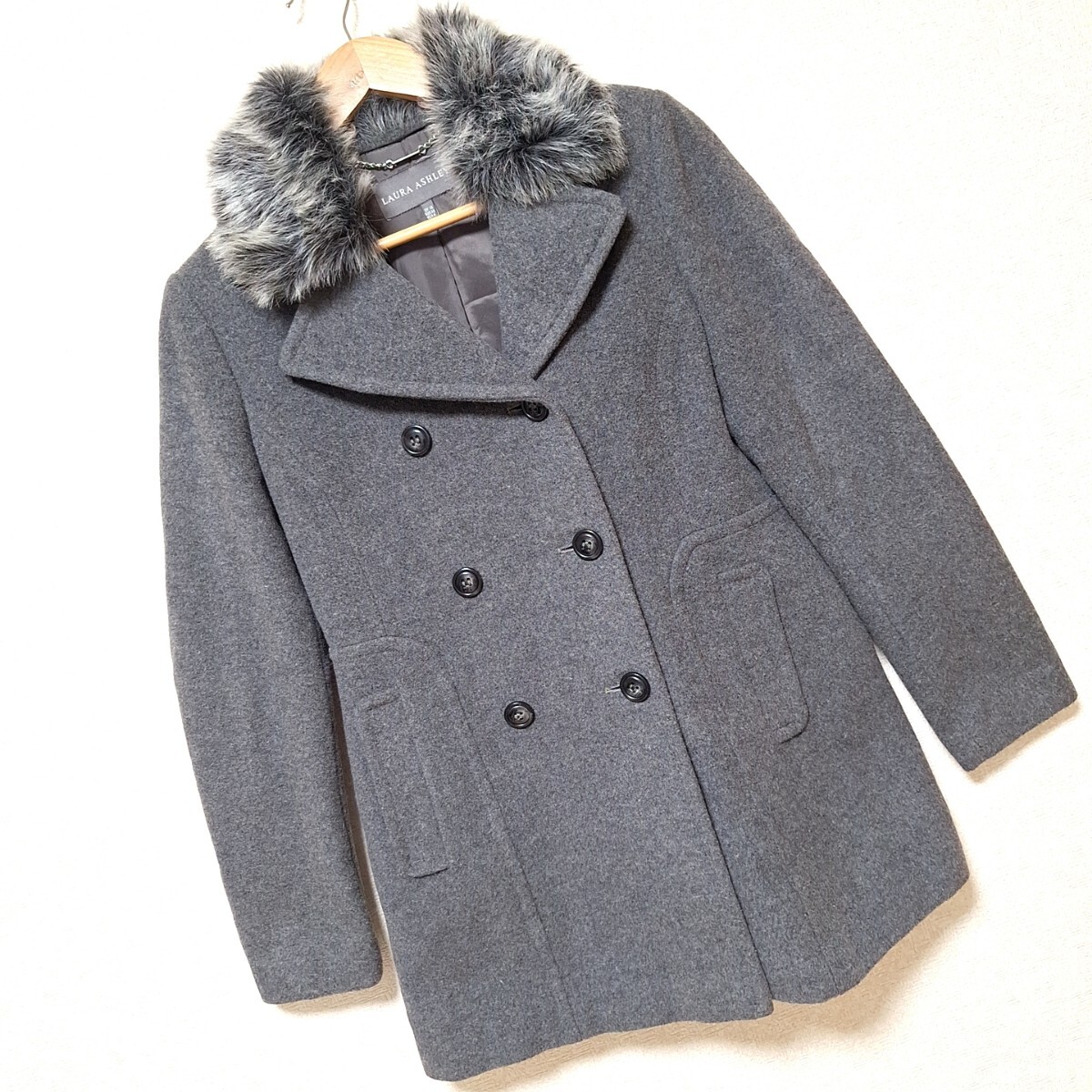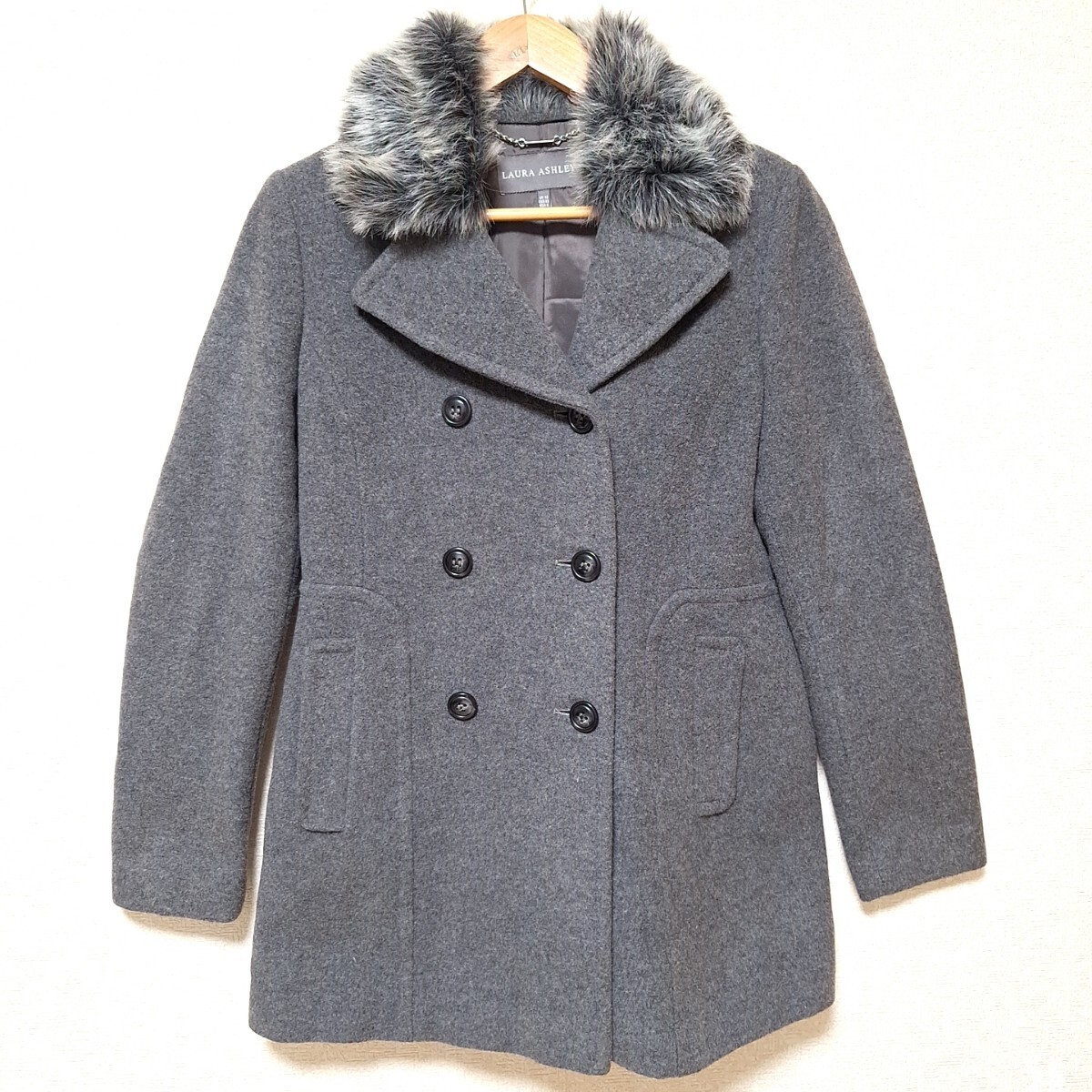 W1101【LAURA ASHLEY】ローラアシュレイ ダブルボタンコート アウター ファー ナイロン混 きれいめ ダークグレー レディース 6(M位)/ee