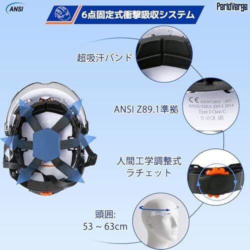 OSHA認証:高耐衝撃かつ貫通抵抗性に優れたABS素材で製造された当社の安全ヘルメットは、軽量で快適な装着感と優れた耐久性を両立しています。Perldverge 建設用ヘルメットはOSHA認証を取得しており、ANSI Z89.1 Type 1 Class C規格に適合しています。ANSI規格番号と製造年月日はヘルメットのつば内側に永久刻印されています