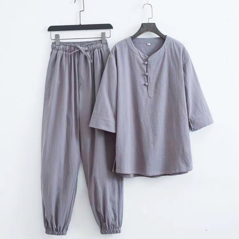 メンズ上下2点セット セットアップ ロングパンツ 綿麻 接触冷感 半袖シャツ チノパン 大きいサイズ ルームウェア 部屋着 グレー L
