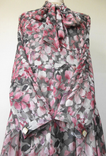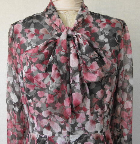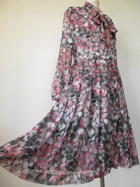 古着♪レトロ・Vintageピンク花柄ボウタイワンピ♪70s60s70年代60年代80年代ヴィンテージ昭和ロマン衣装式アンティークフレンチクラシカル