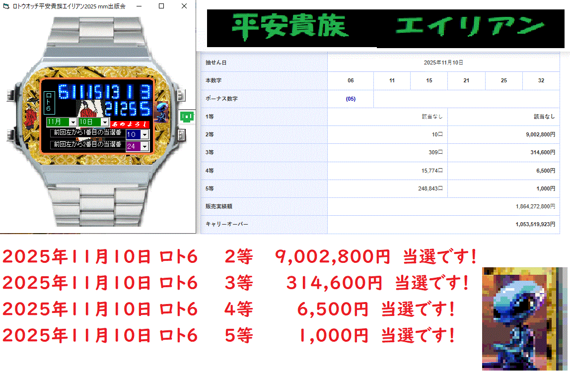 新作■ ロトウオッチ平安貴族エイリアン2025■ 2025年11月10日 ロト6   2等  9,002,800円 当選!