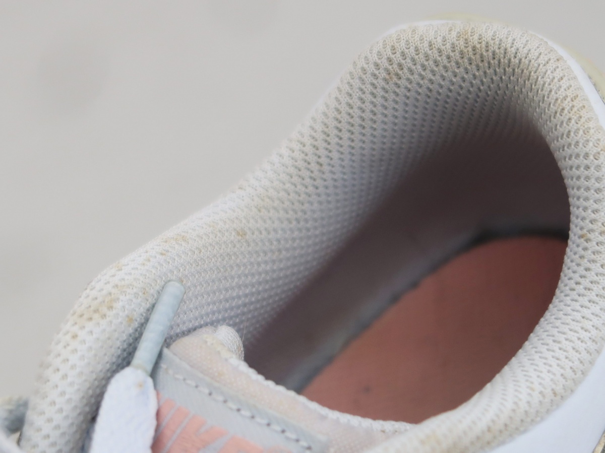 表面にスレやシワ、汚れ、シミ、変色、内部に毛やほこりなどの付着、ソールにすり減りがあります。