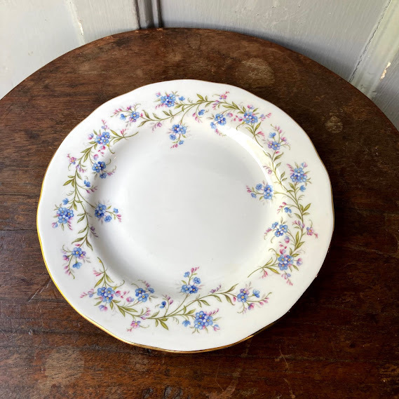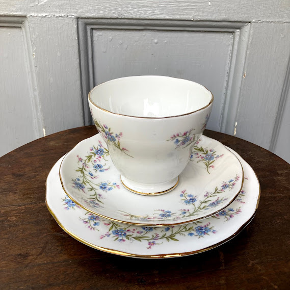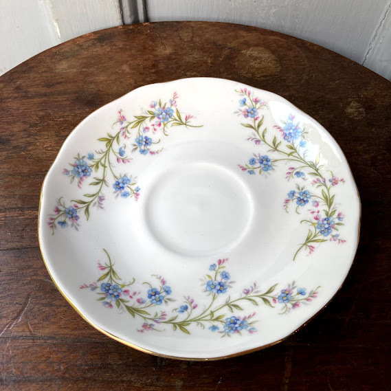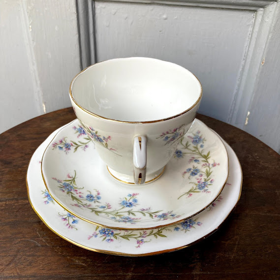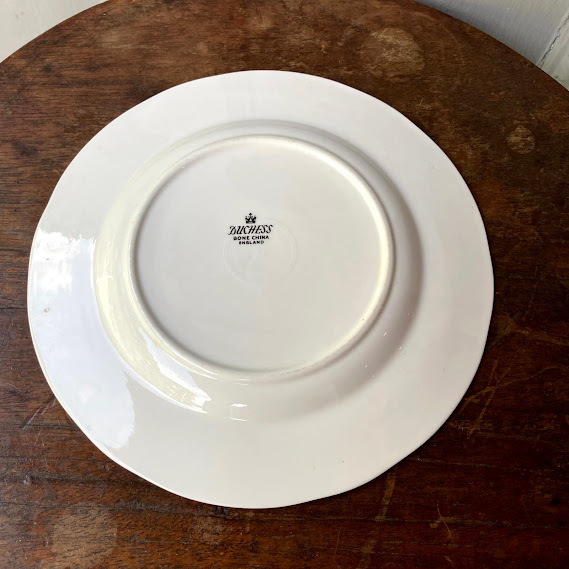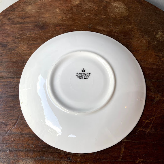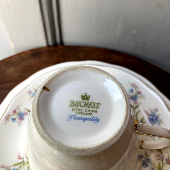 イギリスで1888年から陶磁器の名産地スタッフォードシャーで設立され、伝統的で良質な陶器を作り続けているDUCHESS(ダッチェス)こちらはTranqui;ityというシリーズのブルーの小花をあしらった可愛らしいトリオ(カップ&ソーサー&ケーキプレート)。デザートまで同じお皿で揃うと気分も上がりますね!大きな割れもなくたっぷりとお茶が飲めるサイズ感です。1970年代のビンテージ品となりますので、金彩部分に少し剥がれがございます。年月を経た雰囲気をお楽しみいただける方、おうち時間を楽しみたい方、ビンテージ品がお好きな方におすすめ。同じセットが複数ございますのでお気軽にお問合せください。ひとつ一つのコンディションが違いますので事前に別途画像をご確認をいただいてのお届けとなります。福岡市南区の店舗にてお渡しもできますのでお気軽にどうぞ!