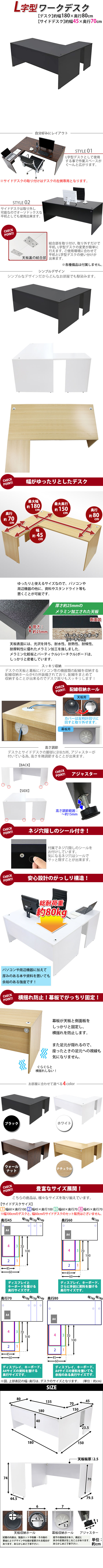 | 商品紹介 | ■作業スペースを広く確保出来る、L字型ワークデスクです。 ■サイドデスクの幅が約45cmのタイプです。 ■会議室や事務所等、オフィス家具として様々なシーンでお使いいただけます。 ■天板には、メラミン加工を施しています。 ■幕板が天板と側面板をがっちりと固定!横揺れを防止します。 ■ネジ穴隠しのシール付き。(サイドデスクのみ付属) ■デスクの天板と幕板に配線収納ホールが2カ所ずつ備わっています。 ■アジャスターで高さの調節が可能です。(高さ調節範囲〜約15mm) ※こちらの商品は、組立て式です。組立てにはプラスドライバーが必要です。お客様でご用意ください。 ※組立図が付属します。 ※サイドデスクの取り付けはデスクの左側専用となります。 ■材質:パーティクル(パーチクル)ボード(メラミン加工)(本体、サイドデスク)、プラスチック(アジャスター、配線収納ホール) ■重量:約60kg(デスク:約47kg、サイドデスク:約13kg) ■総耐荷重:約80kg ●新品商品ではありますが、輸入商品の為、多少の擦り傷などがある場合がございますので、ご納得の上ご購入下さいませ。 ●ご購入後、お客様ご都合によるご返品、ご返金等は一切お受け致しておりません。 ●本商品を使用した際に発生したトラブル、事故につきまして、当社は一切の責任を負いません。ご使用に関しましては、全て自己責任にてお願い致します。 ※カラーはブラックとなります。 |