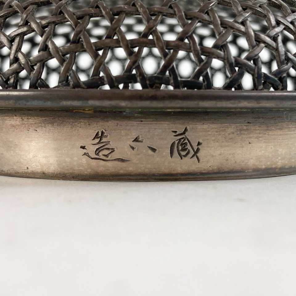 | 商品説明 | 中国古玩、龍泉青磁の香炉に蔵六造の銀火屋が添えられた一品です。 淡く澄んだ青磁釉が美しく、端正な器形に龍泉窯特有の深みある色調がよく表れています。 銀火屋(火舎)は「蔵六造」の銘があり、繊細な透かし文様が施された上質な仕立てです。 火舎の重量は約62g。香炉本体との調和も見事で、格調高い趣を備えています。 |