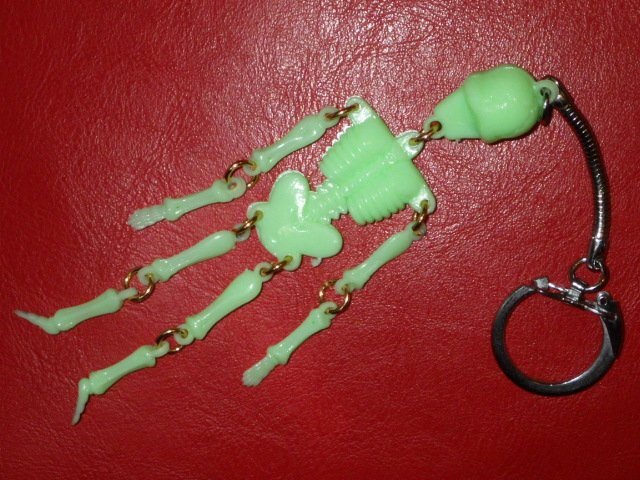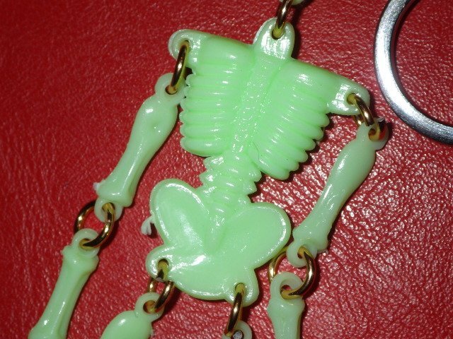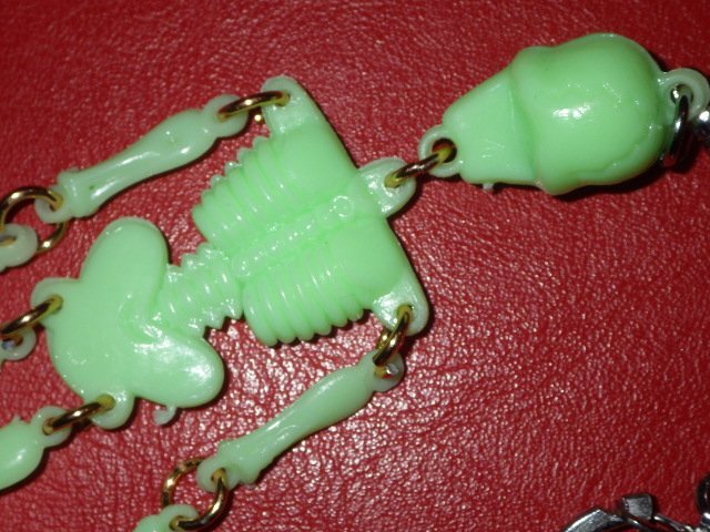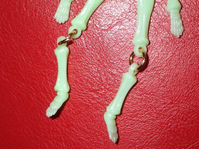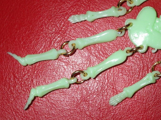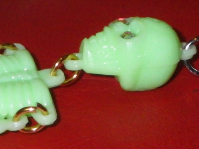カラーはミントグリーン、素材は夜光/蓄光のプラスチック、光を吸収し、手のひらの中に入れて覗くと暗闇でうっすらと光る懐かしいアレです、元々チープなオモチャ、チープトイになります、味のある表情のスカルでキモ可愛いです♪(価格は1点のお値段です)