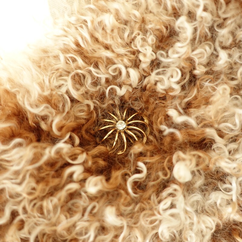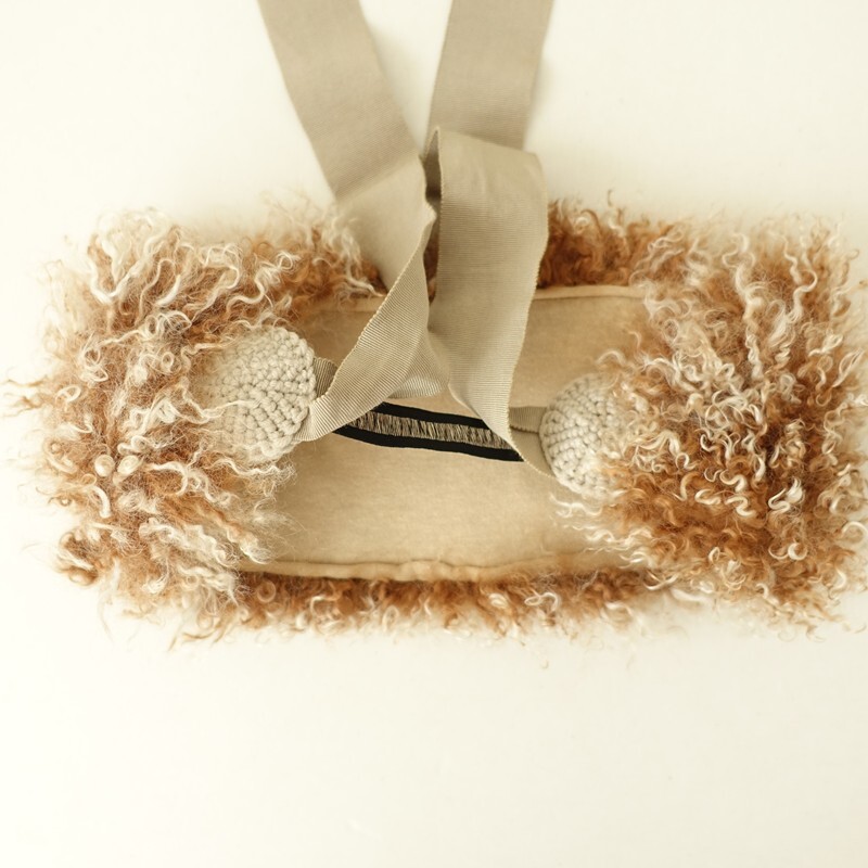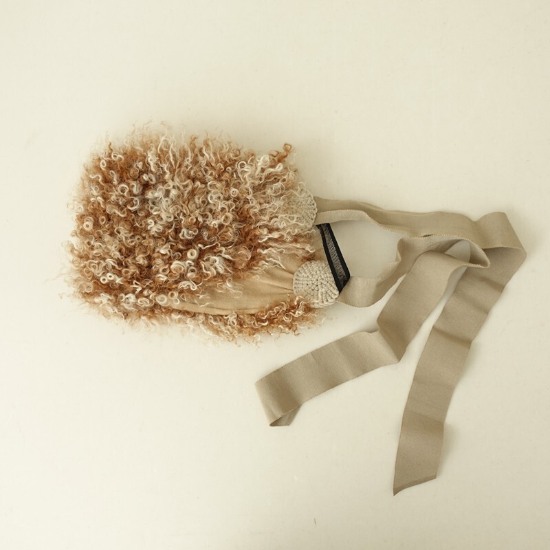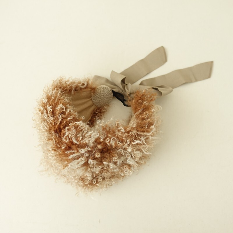 | hitomi shinoyamaのヘアアクセサリーです。カラーは、ブラウンとオフホワイトのモヘアかと思われる、くるくるとしてふあふあの手触りの ボリュームのあるヘアアクセサリーです。リボンで結んで着用する仕様です。 |