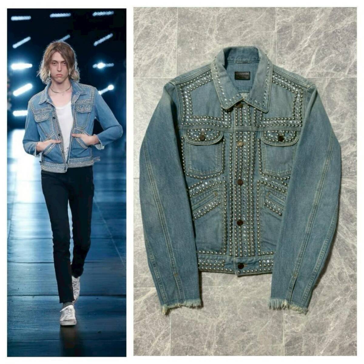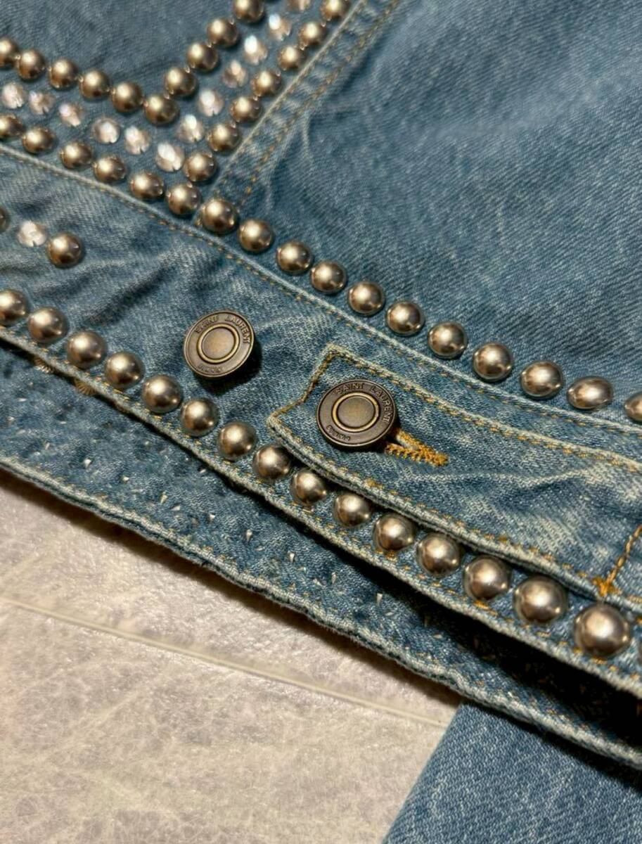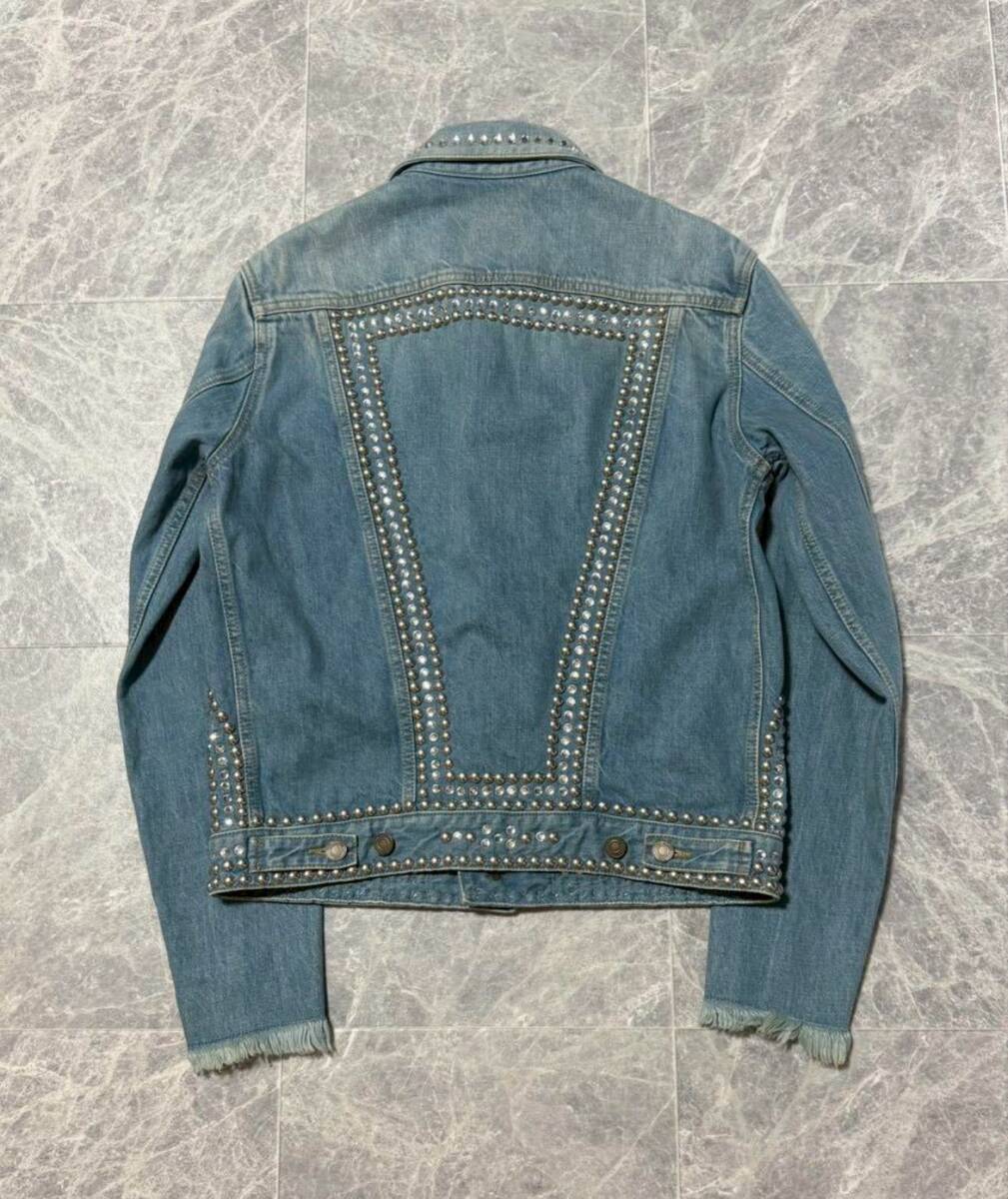 商品名: SAINT LAURENT PARIS by Hedi Slimane 2016SS Collection Crystal Studded Damage Processed Denim Jacket サンローラン パリ 2016年 春夏 コレクション ランウェイ エディスリマン スタッズ クリスタル ウォッシュド ダメージ 加工 フリンジ デニム ジャケット サイズM ライトブルー