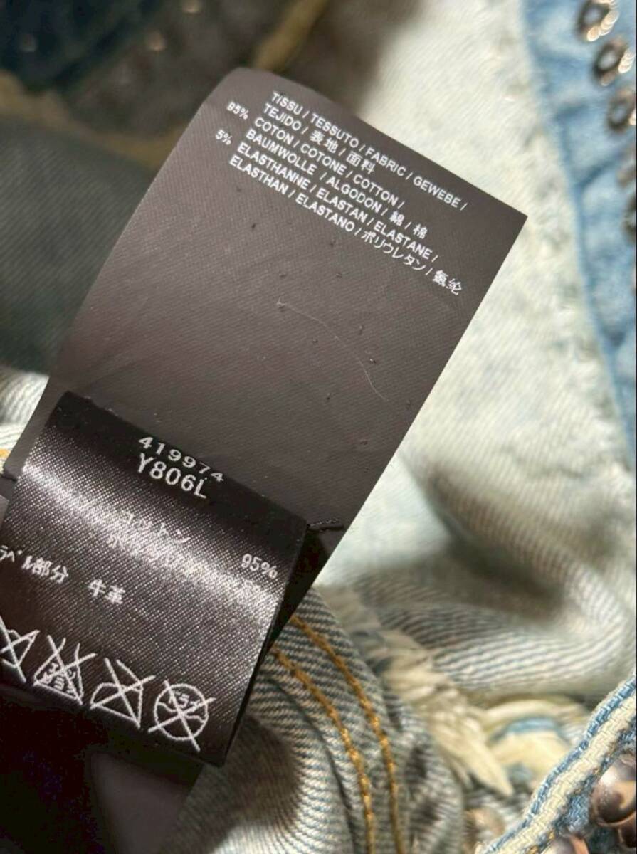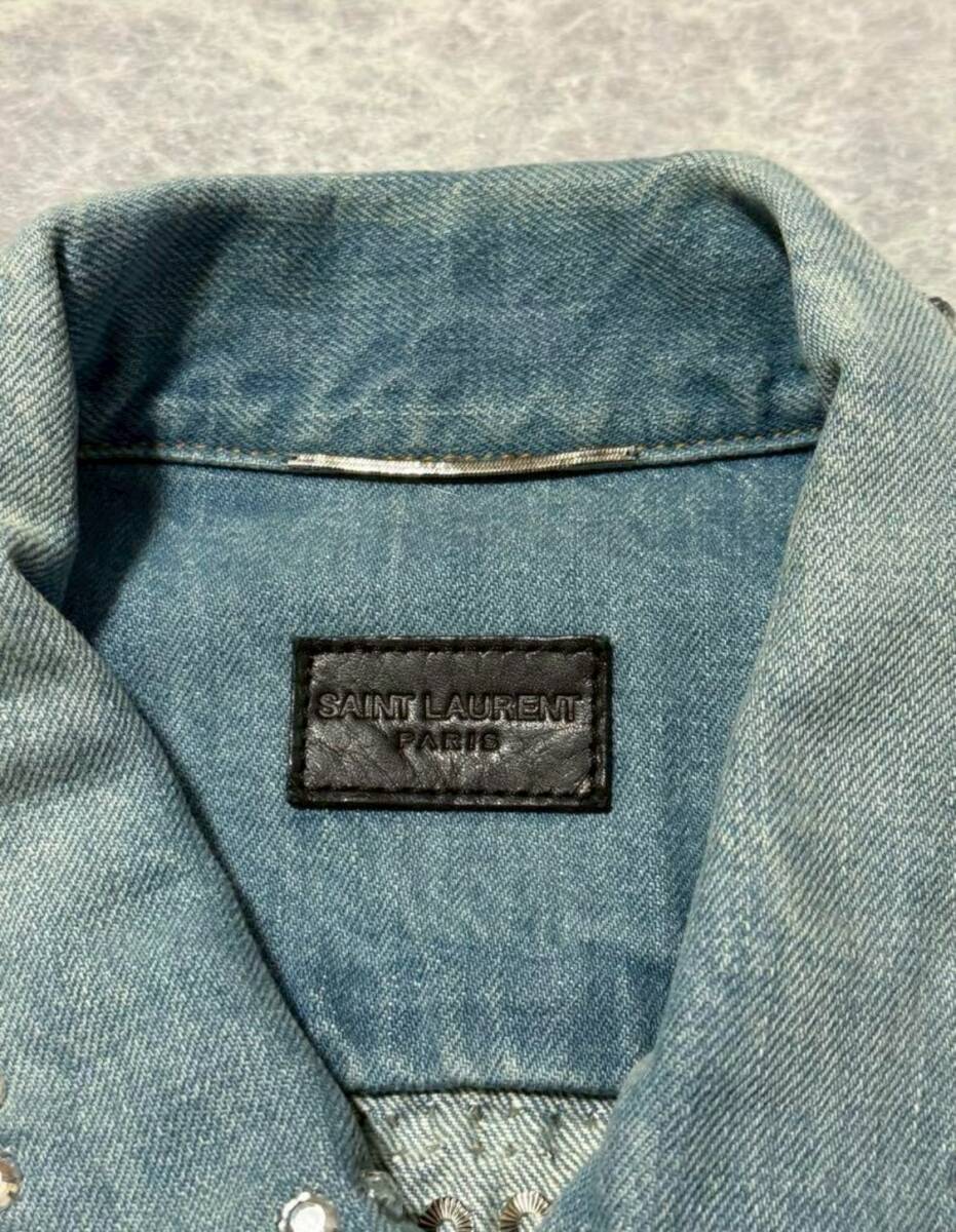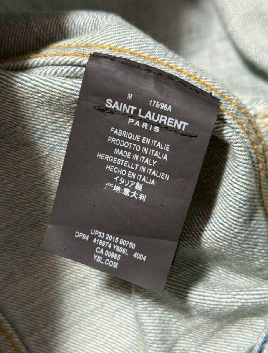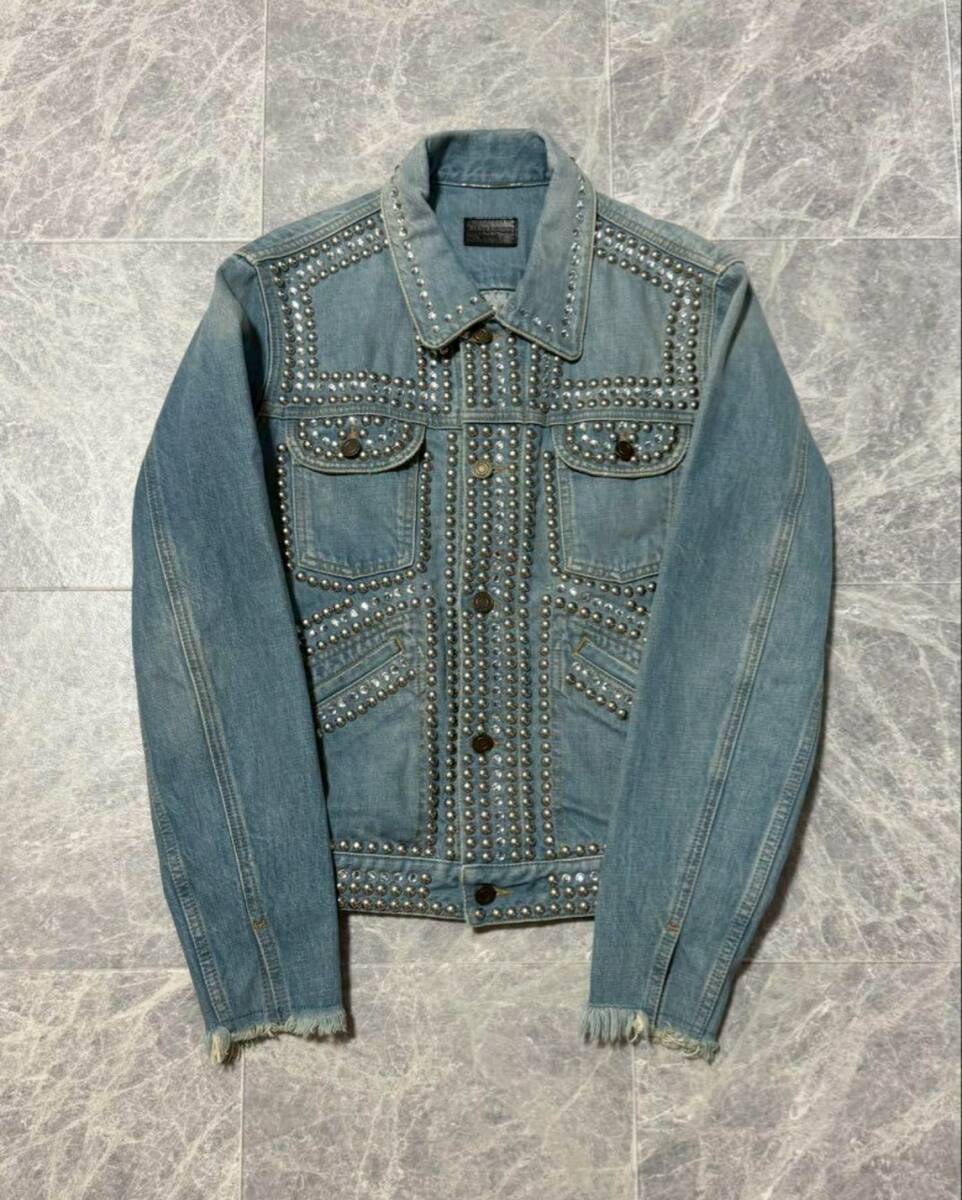 商品名: SAINT LAURENT PARIS by Hedi Slimane 2016SS Collection Crystal Studded Damage Processed Denim Jacket サンローラン パリ 2016年 春夏 コレクション ランウェイ エディスリマン スタッズ クリスタル ウォッシュド ダメージ 加工 フリンジ デニム ジャケット サイズM ライトブルー