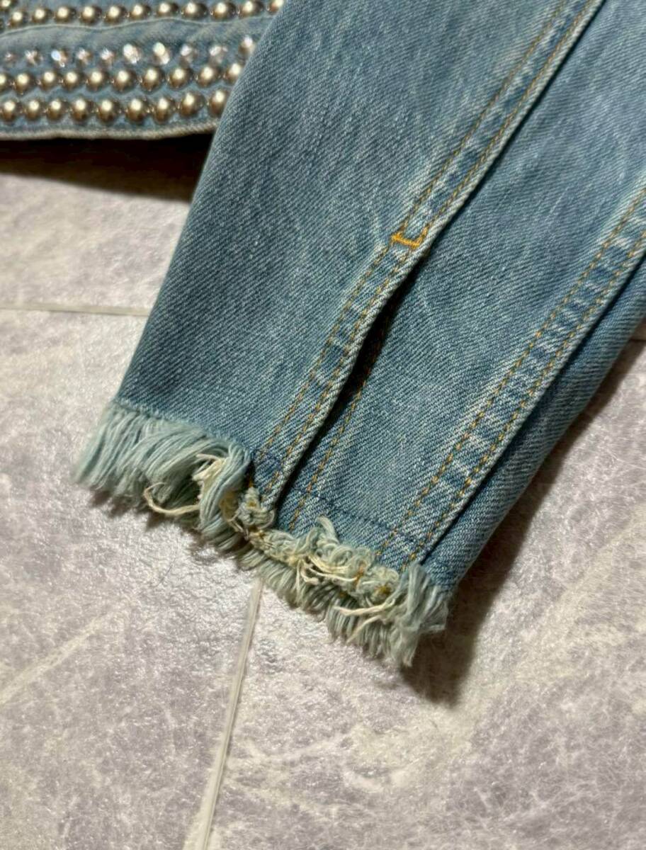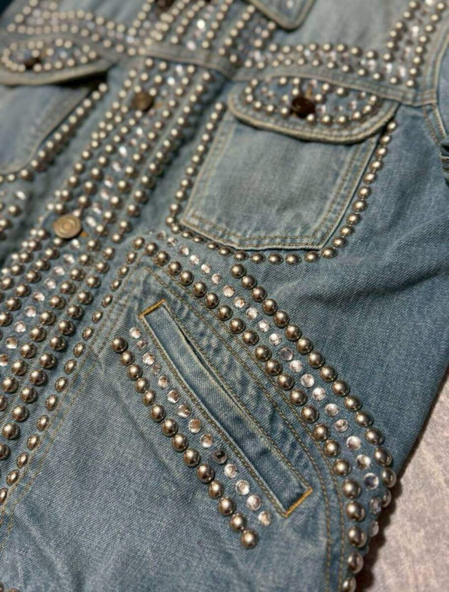 ウォッシュ加工を施したストレッチ性のあるデニムに、クリスタル、ラウンドスタッズを豪華に装飾したジャケット。