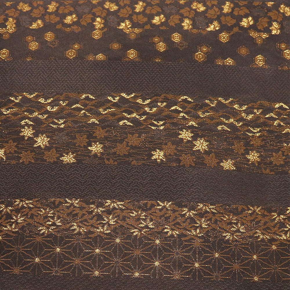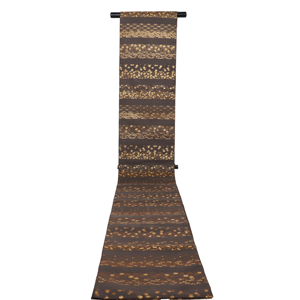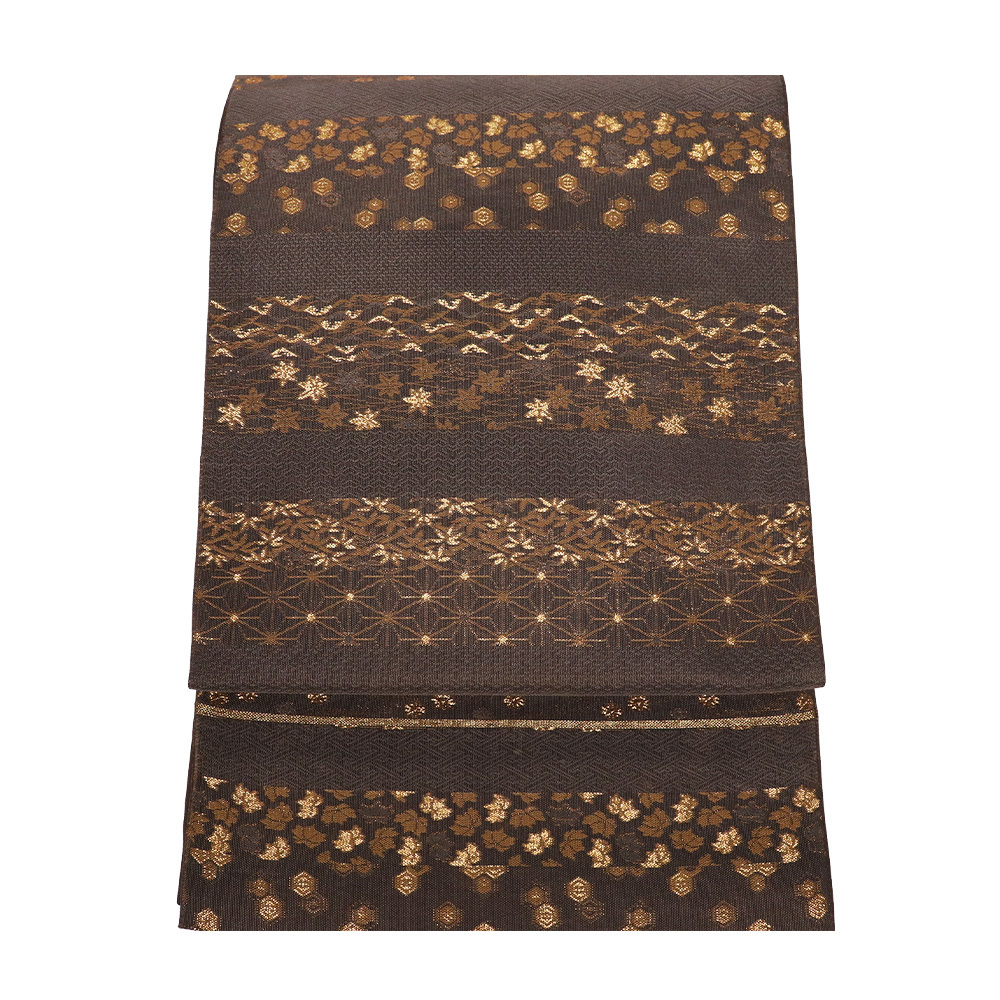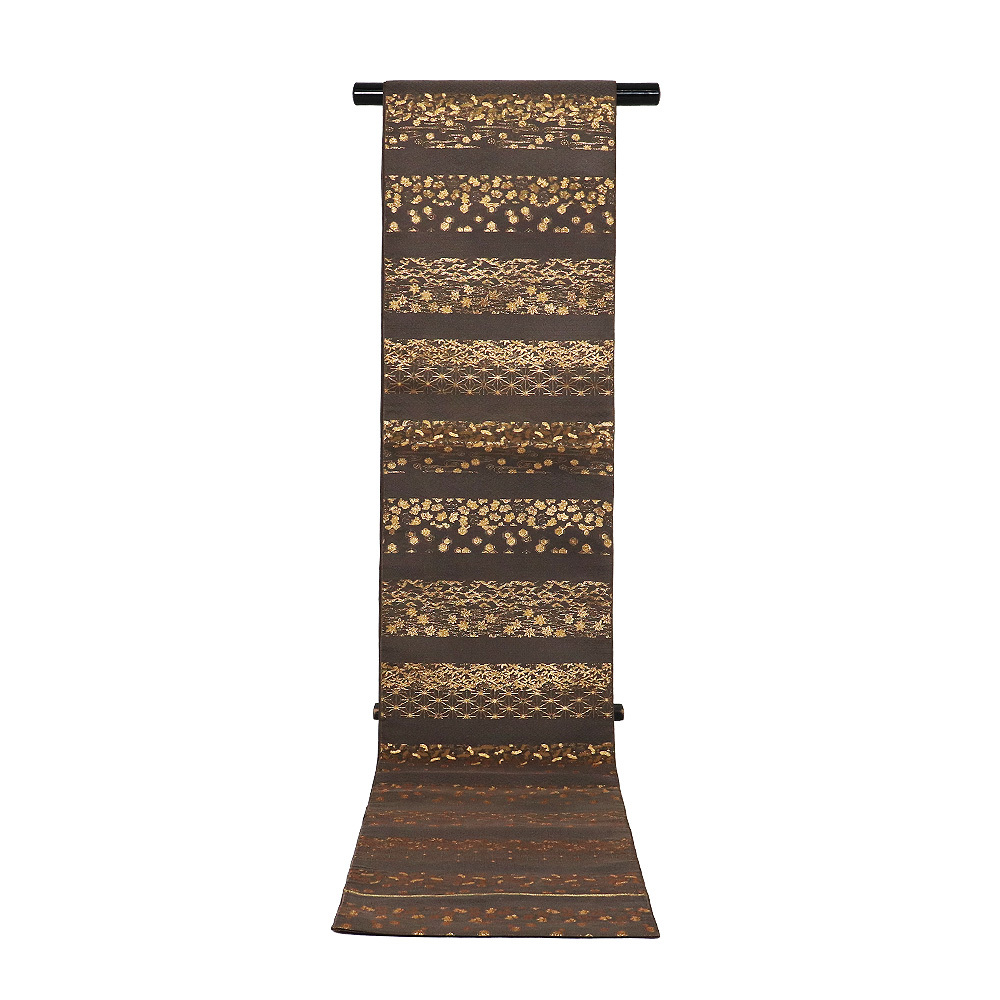 | 商品 | 西陣織袋帯 本袋帯 全通 抹茶色・緑・金箔地 地紙文・菊・紅葉・笹・麻の葉・亀甲文 仕立て上がり |