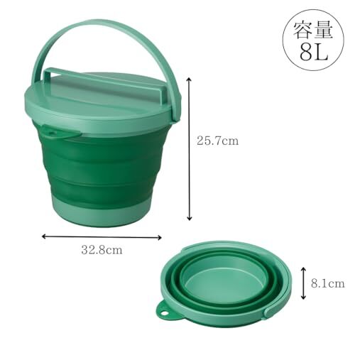 イセトウ(Isetou) 折りたたみバケツ ソフトバケツ(フタ付き) グリーン 8L 幅32.8×奥行30.0×高さ8.1~25.7cm 日本製 耐熱100℃ 防災 折りたたみ バケツ 洗濯機 吊り下げ 丸形 コンパクト 清掃用品 洗車 I-553