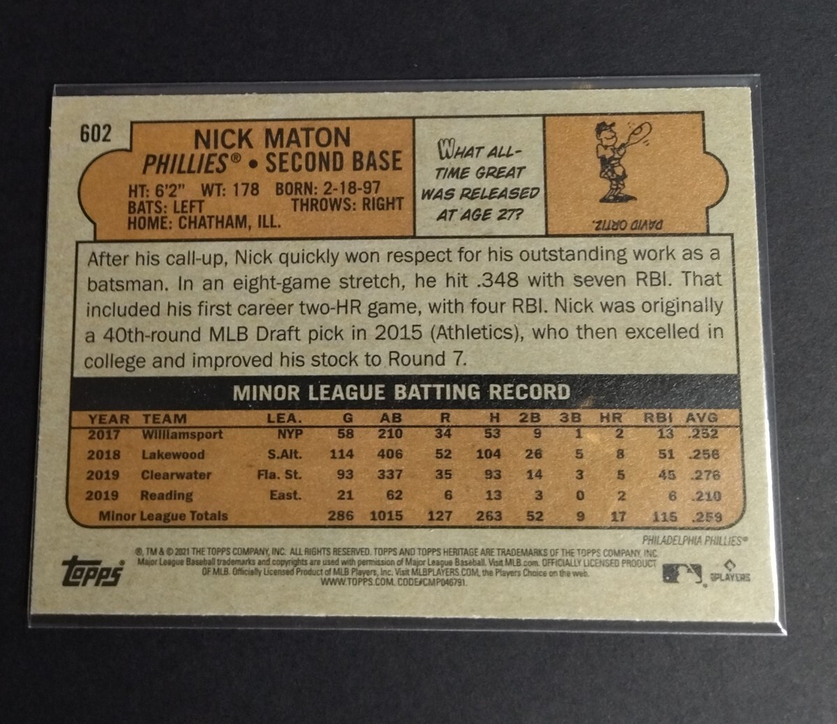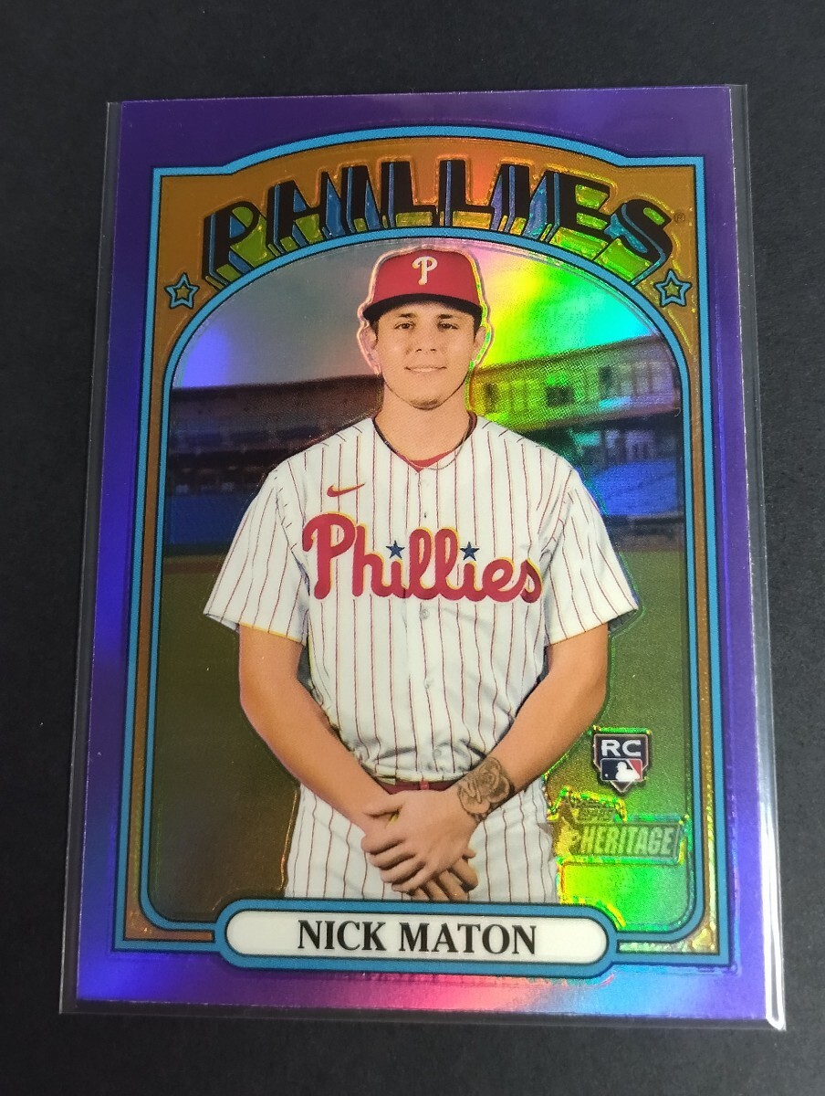 MLB 2021年topps HERITAGE ニック・メイトン(フィリーズ)ルーキーカード。パープルリフラクター。No,602。NICK MATON Refractor RC