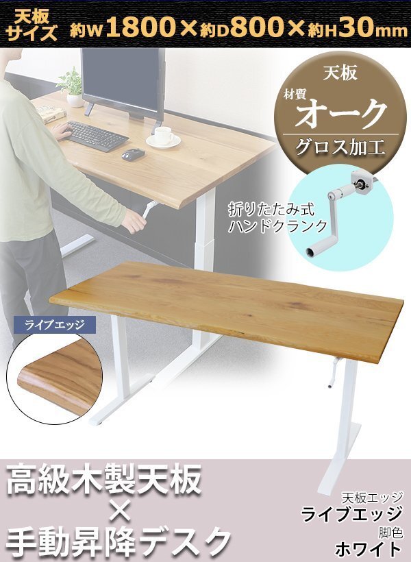 | 商品名 | 送料無料 昇降デスク 手動 W1800×D800×H735〜1185mm オーク材 高級 木製 天板 グロス加工 耐荷重約70kg(脚部) スタンディングデスク 上下昇降 デスク 手動昇降 上下昇降 昇降デスク 高さ 調整 オフィスデスク 昇降式デスク 昇降テーブル 昇降式テーブル ライブエッジ 脚色 ホワイト hk01180oakg |