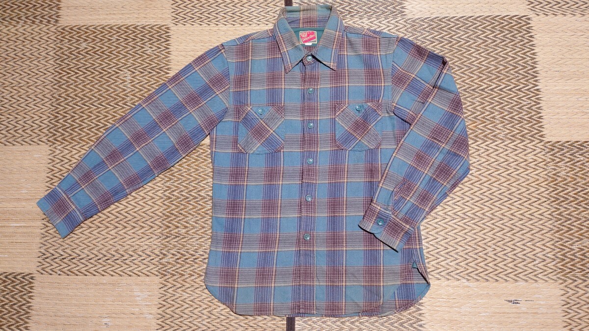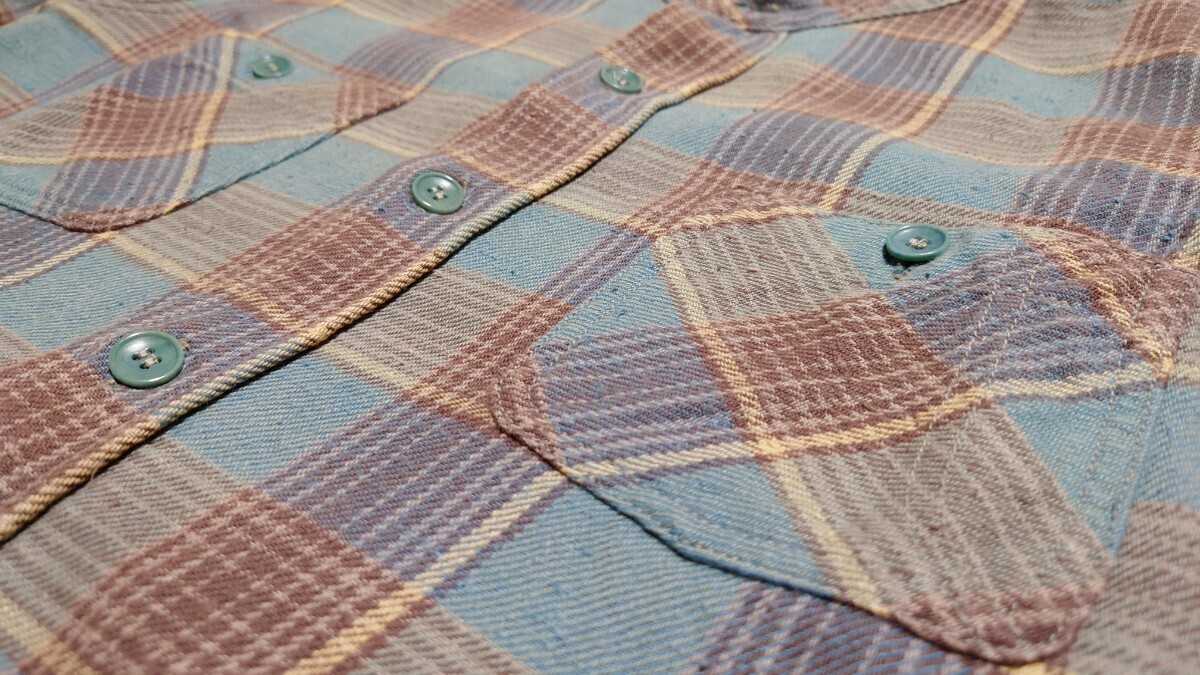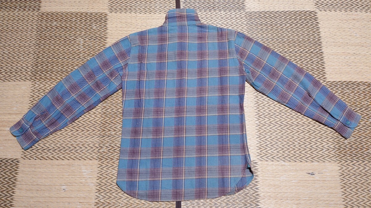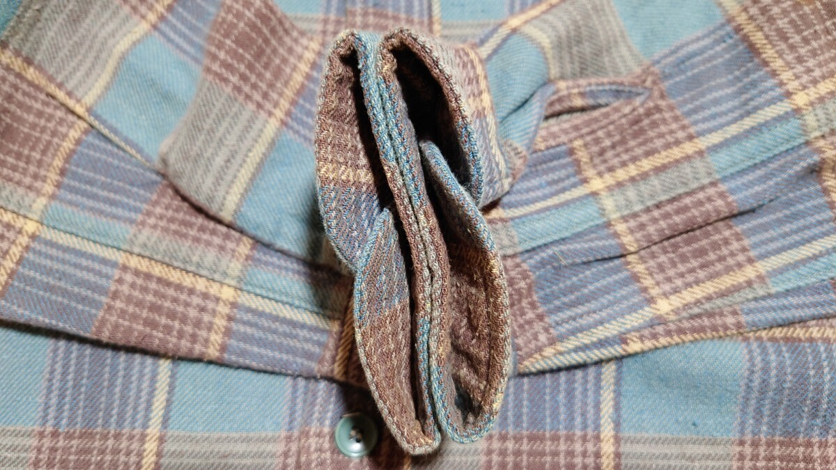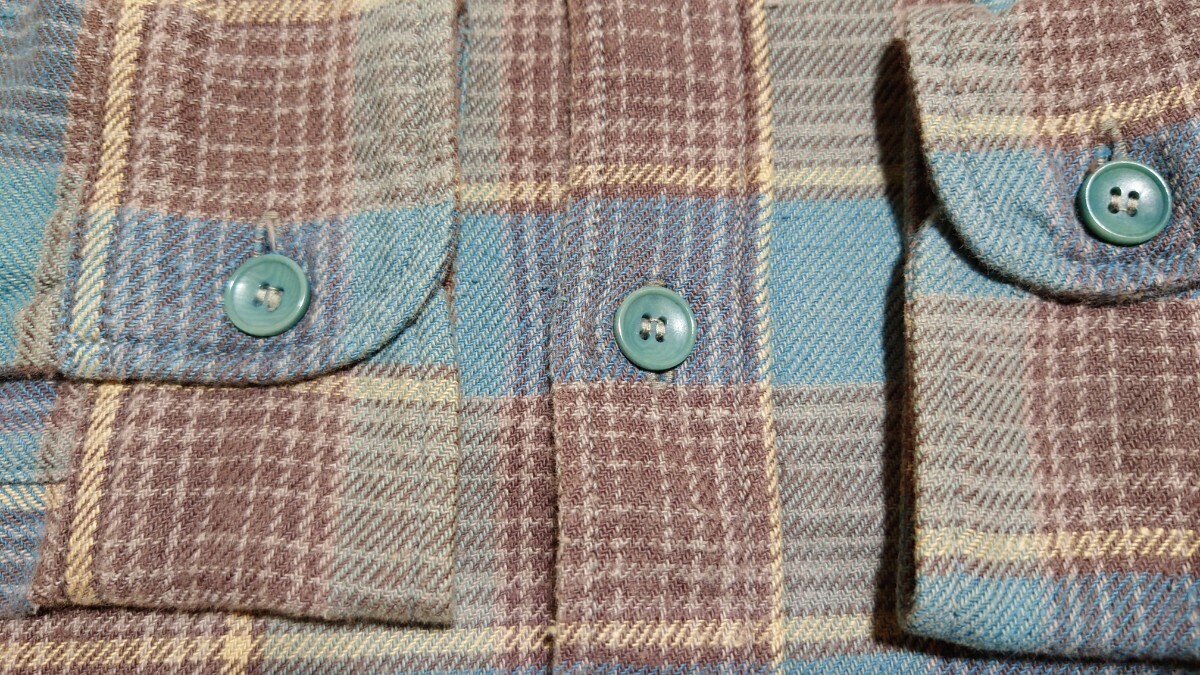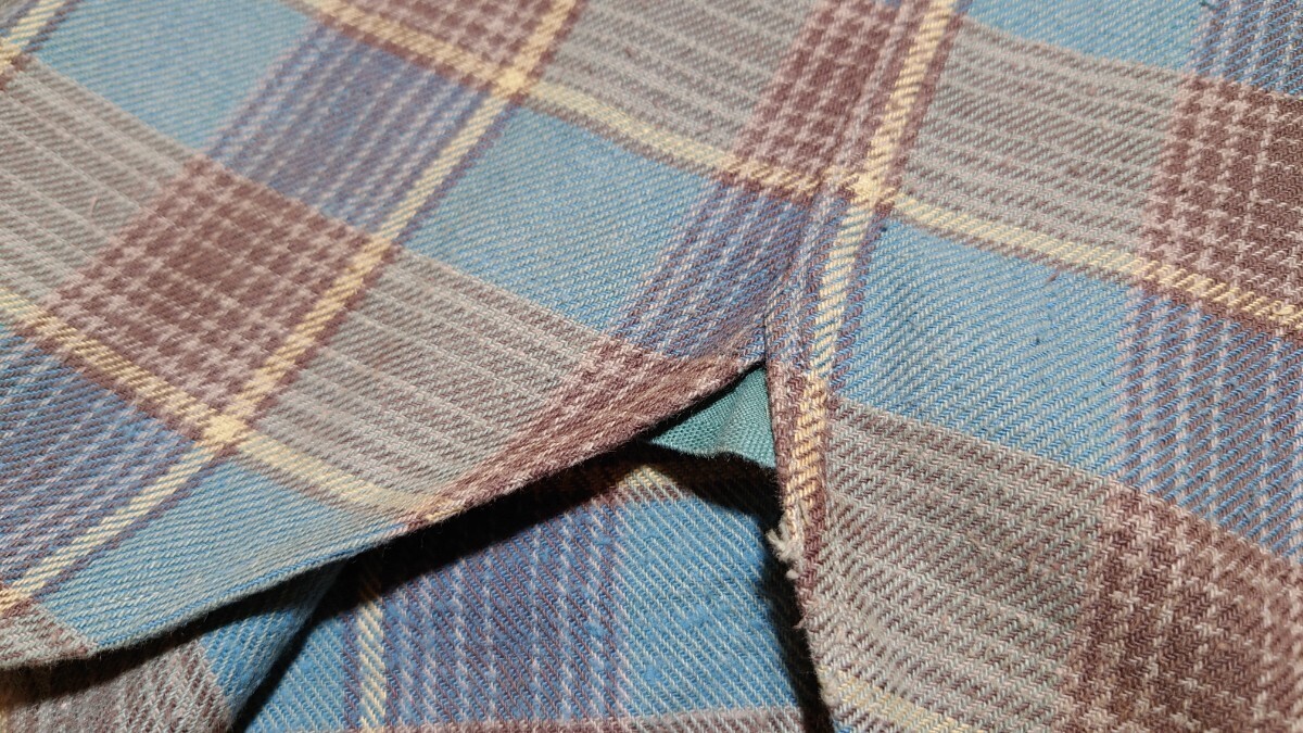 くすんで緑掛かったブルーをベースに、焼けたようなベージュ、ブラウンのチェックです。