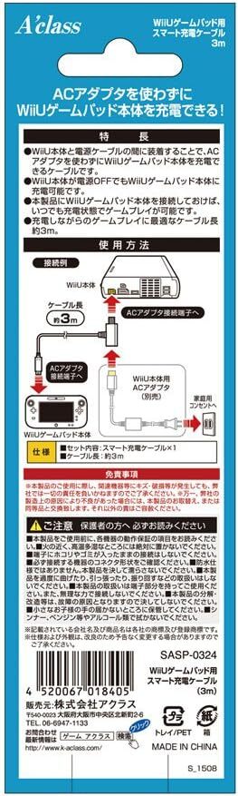 ★★ 任天堂 Nintendo WiiU ゲームパット用スマート充電ケーブル 3m GamePad 本体Offでも充電可 動作確認 ACアダプタ不要 Wii U ☆★
