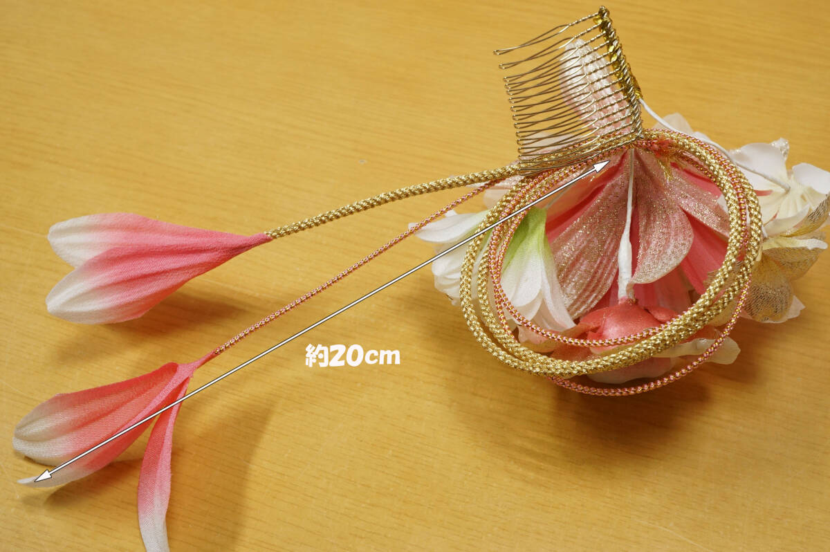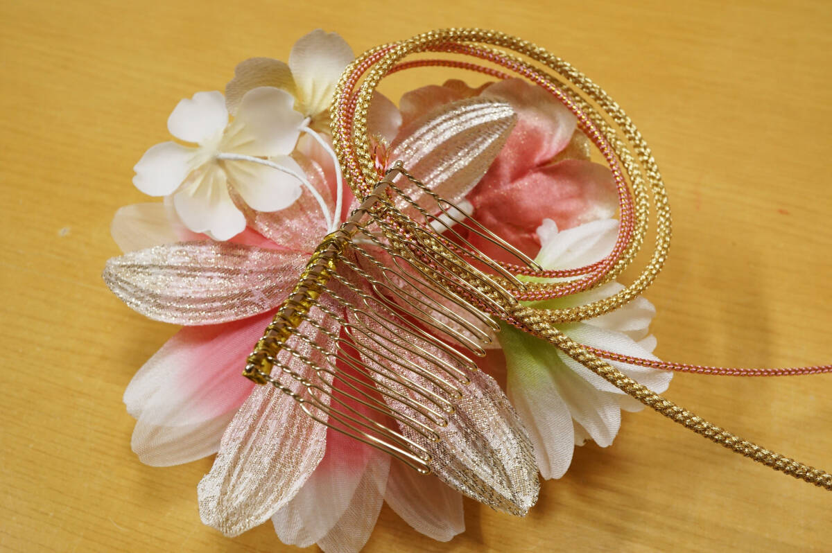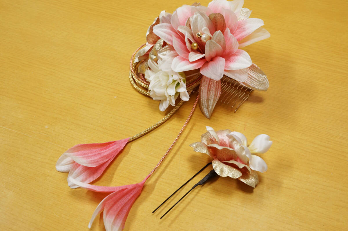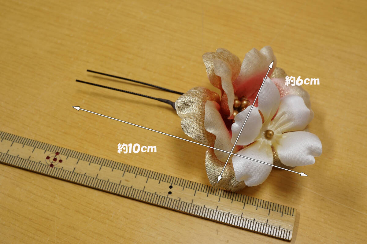 コーム型と、Uピンタイプの2点組で、ピンク系/オフ白にラメゴールドと、さりげない気品さを感じられる色合いかと思われます。