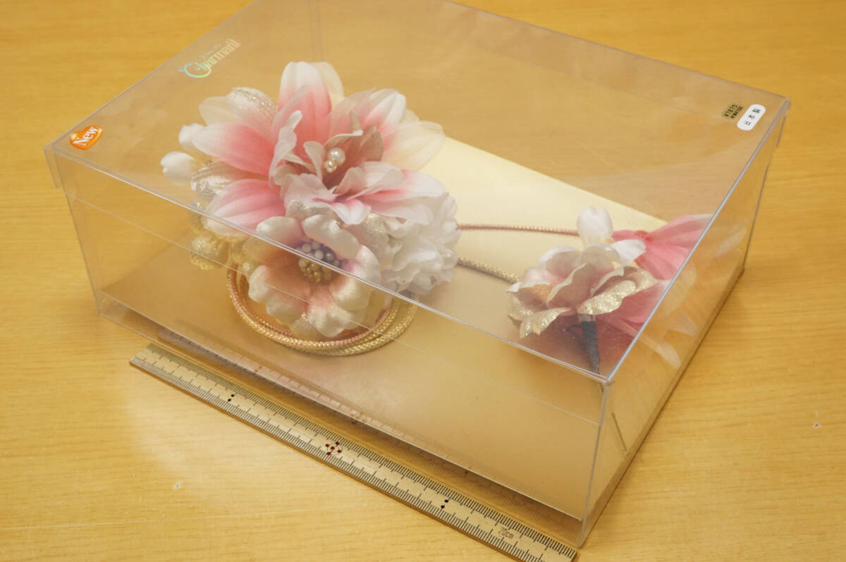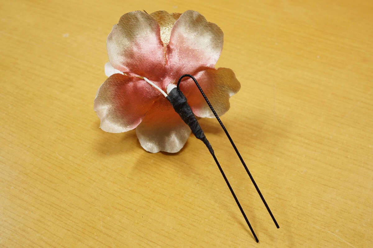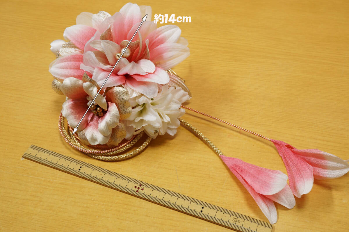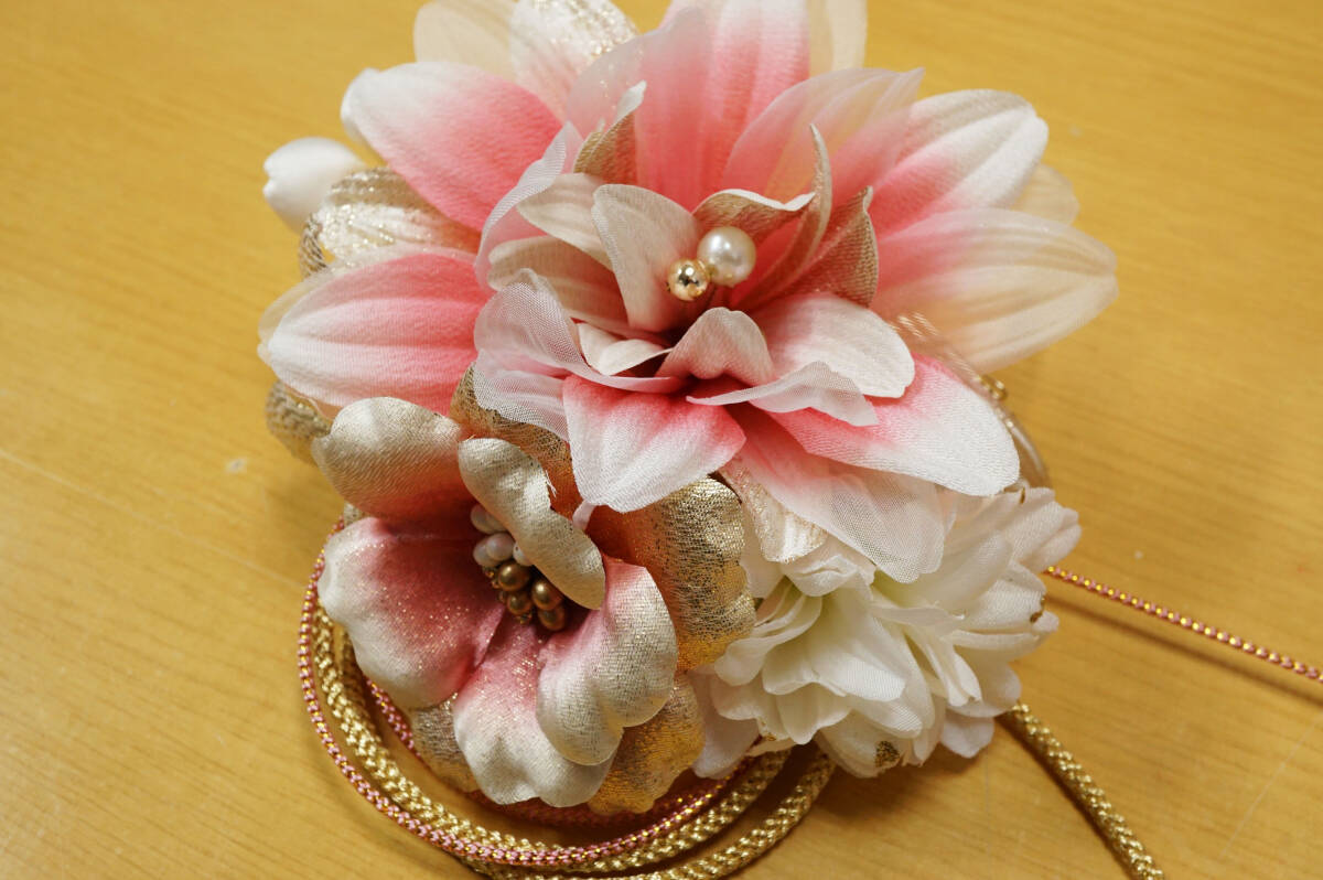 コーム型と、Uピンタイプの2点組で、ピンク系/オフ白にラメゴールドと、さりげない気品さを感じられる色合いかと思われます。