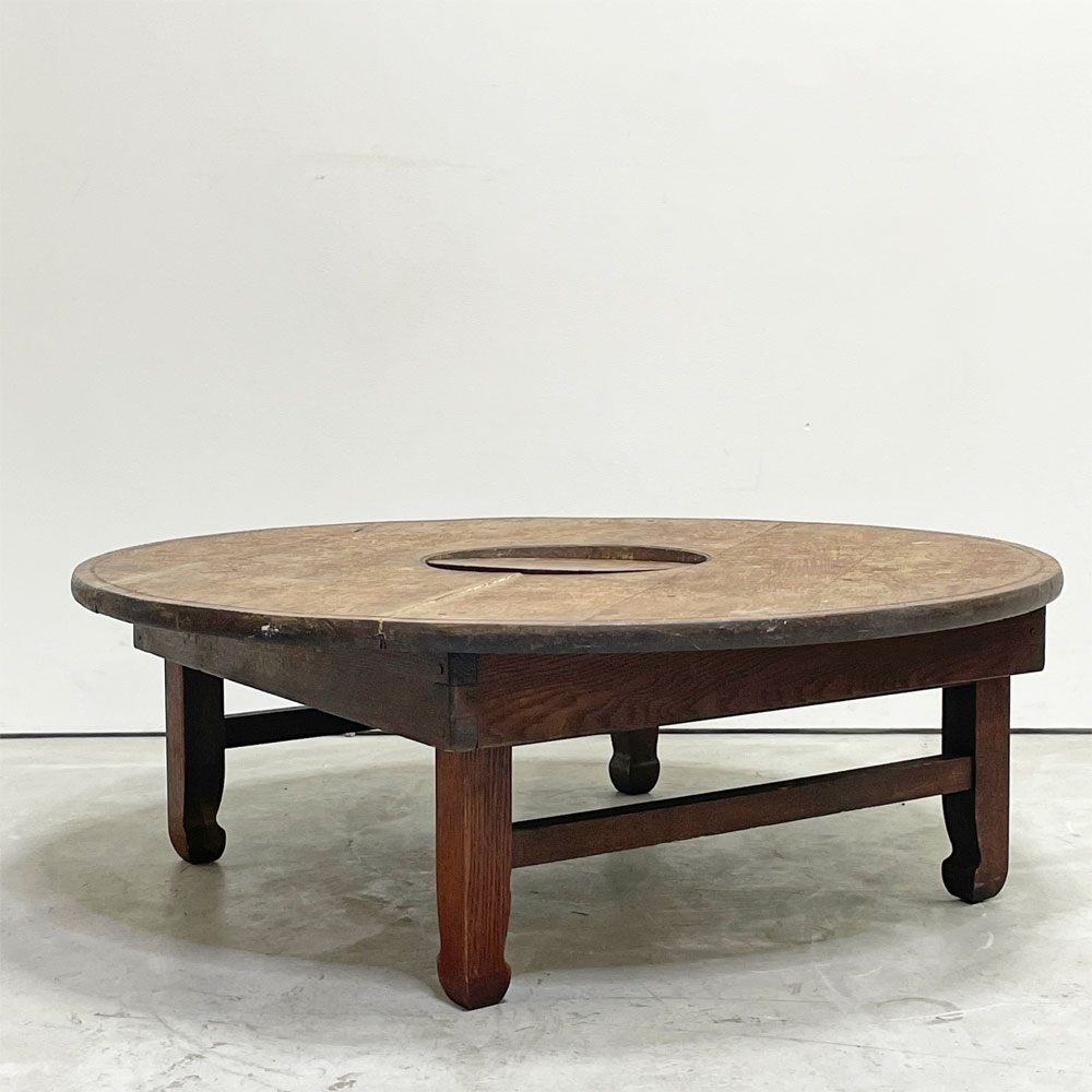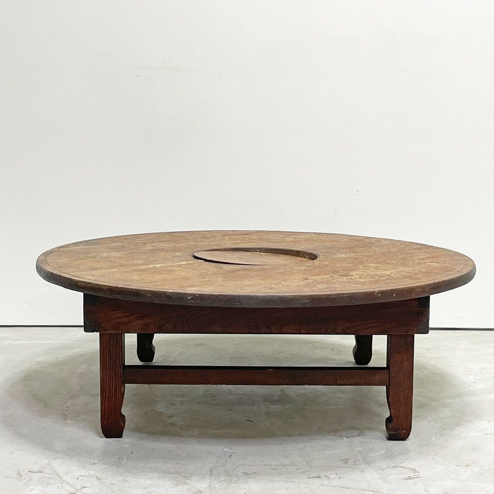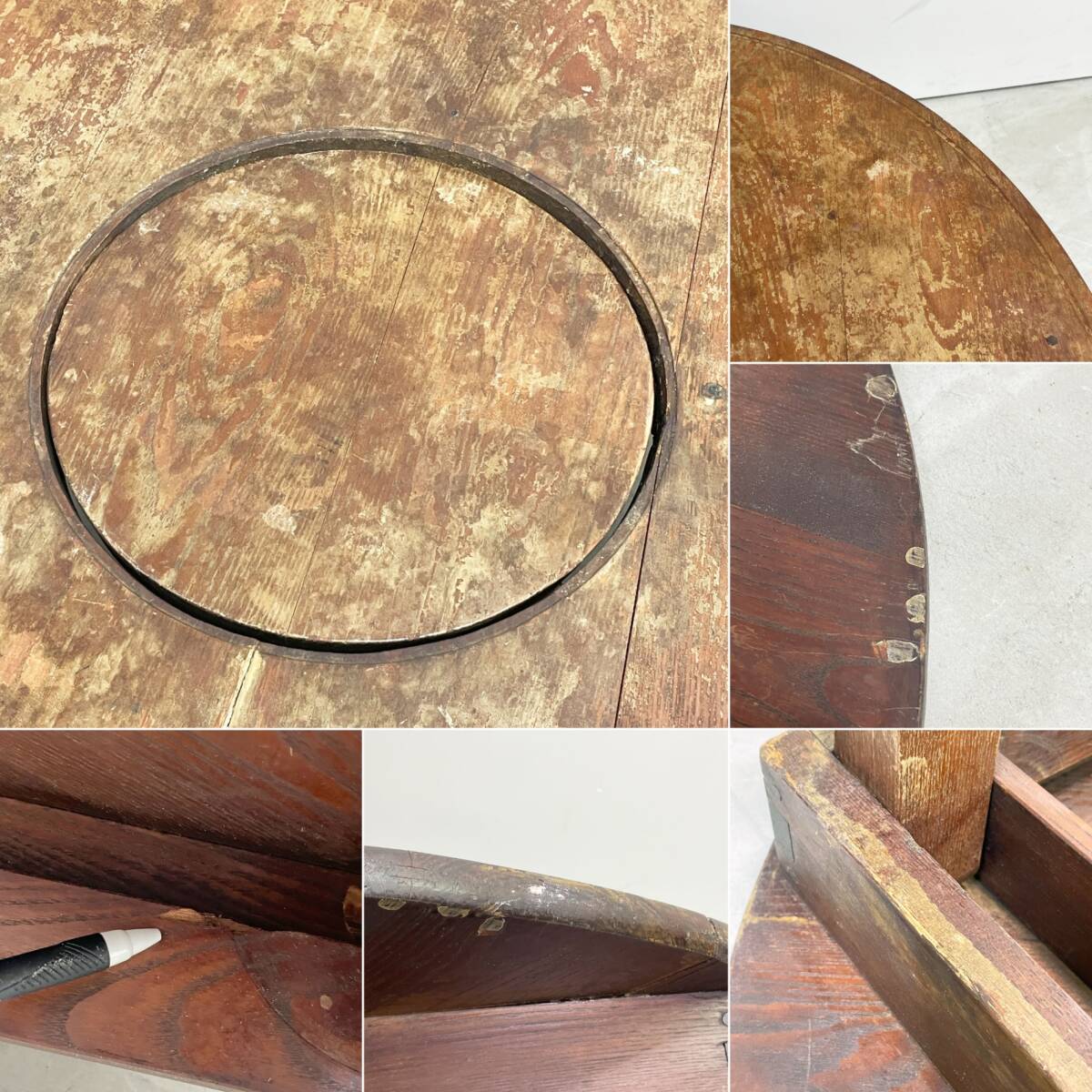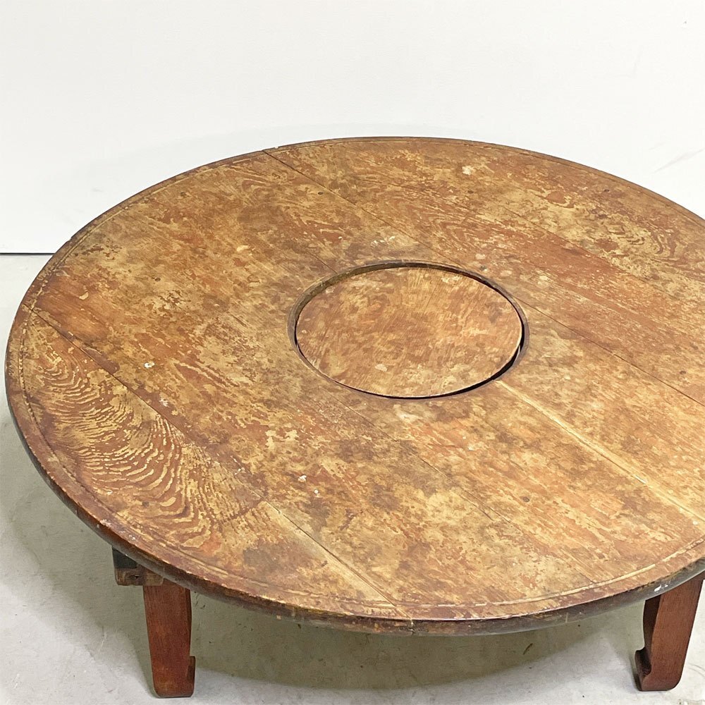 | コメント | 趣き溢れるジャパンビンテージのアイテム、こちらは古い木味が魅力的な木製のちゃぶ台です。 まあるいラウンド天板の中央には取外し可能な天板があり、こちらを外すと丁度真ん中だけがくり抜かれる構図に。 ここに火鉢等を置いていたのでしょうか?色々な用途が想像できる魅力的な仕様です。 更に脚部は折り畳む事が可能で、木材のみで組み上げられた大胆かつ繊細なギミックからは当時の職人の拘りが感じられます。 天板サイズも現代において十分に使える大きさで、ご自宅から店舗用インテリア、撮影用にもお勧めできる一点です。 ※当ショップは、主にリサイクル品を取り扱っております。基本的にUSED品である事をご理解頂き、ご入札をご検討下さいませ。 |