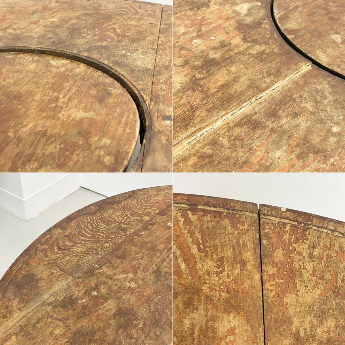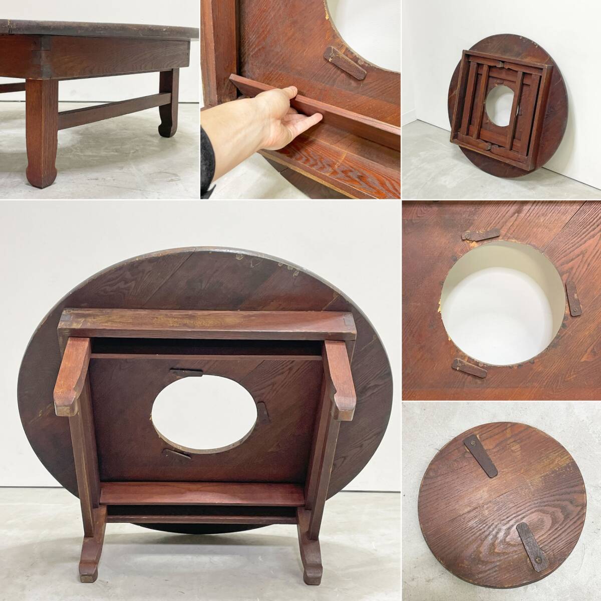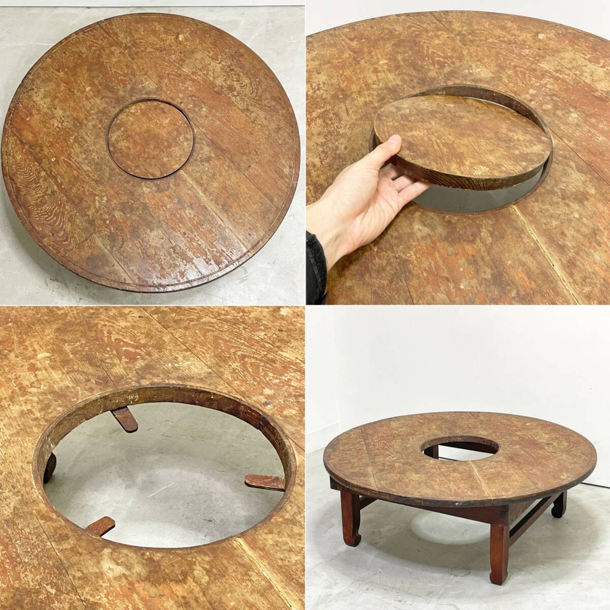 | コメント | 趣き溢れるジャパンビンテージのアイテム、こちらは古い木味が魅力的な木製のちゃぶ台です。 まあるいラウンド天板の中央には取外し可能な天板があり、こちらを外すと丁度真ん中だけがくり抜かれる構図に。 ここに火鉢等を置いていたのでしょうか?色々な用途が想像できる魅力的な仕様です。 更に脚部は折り畳む事が可能で、木材のみで組み上げられた大胆かつ繊細なギミックからは当時の職人の拘りが感じられます。 天板サイズも現代において十分に使える大きさで、ご自宅から店舗用インテリア、撮影用にもお勧めできる一点です。 ※当ショップは、主にリサイクル品を取り扱っております。基本的にUSED品である事をご理解頂き、ご入札をご検討下さいませ。 |