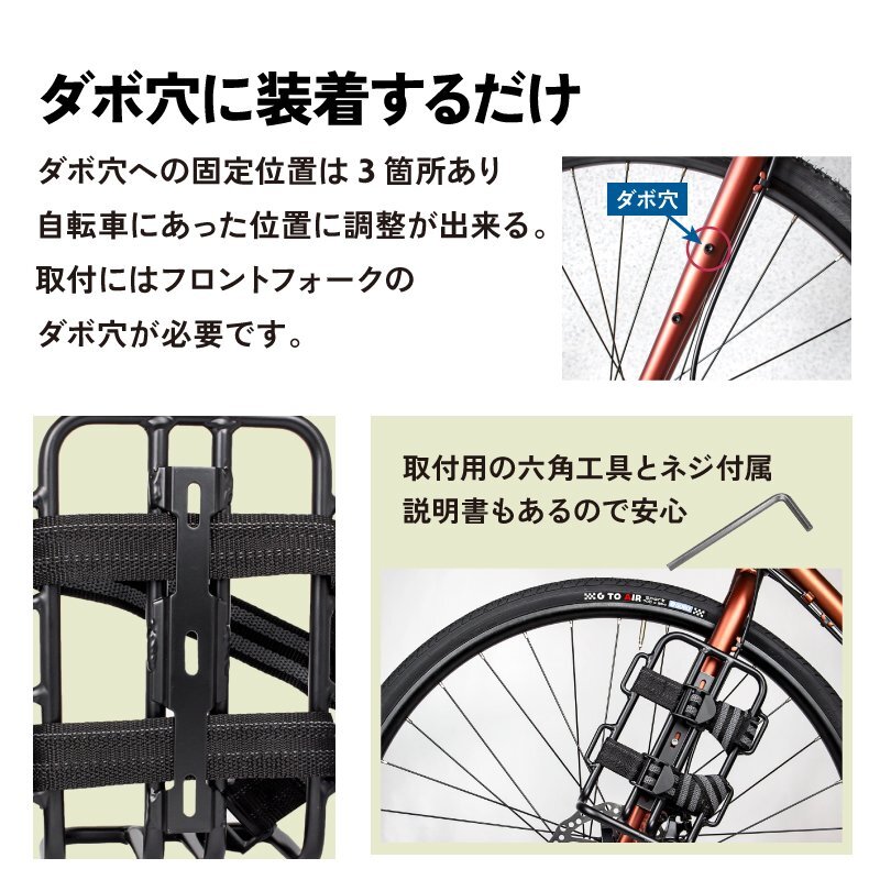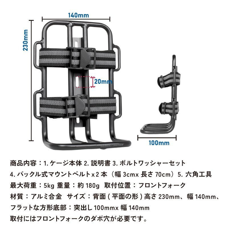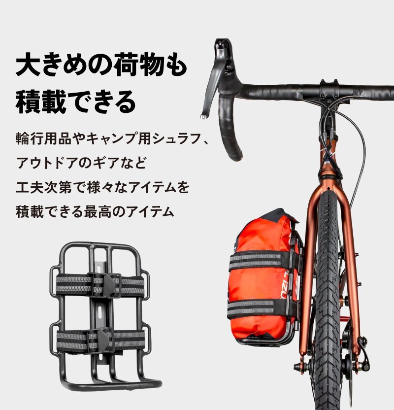 このカーゴケージは、フロントフォークに取り付けることで、様々なアイテムを簡単に積載できます。ダボ穴に固定するタイプなので、取り付けも簡単です。 | |