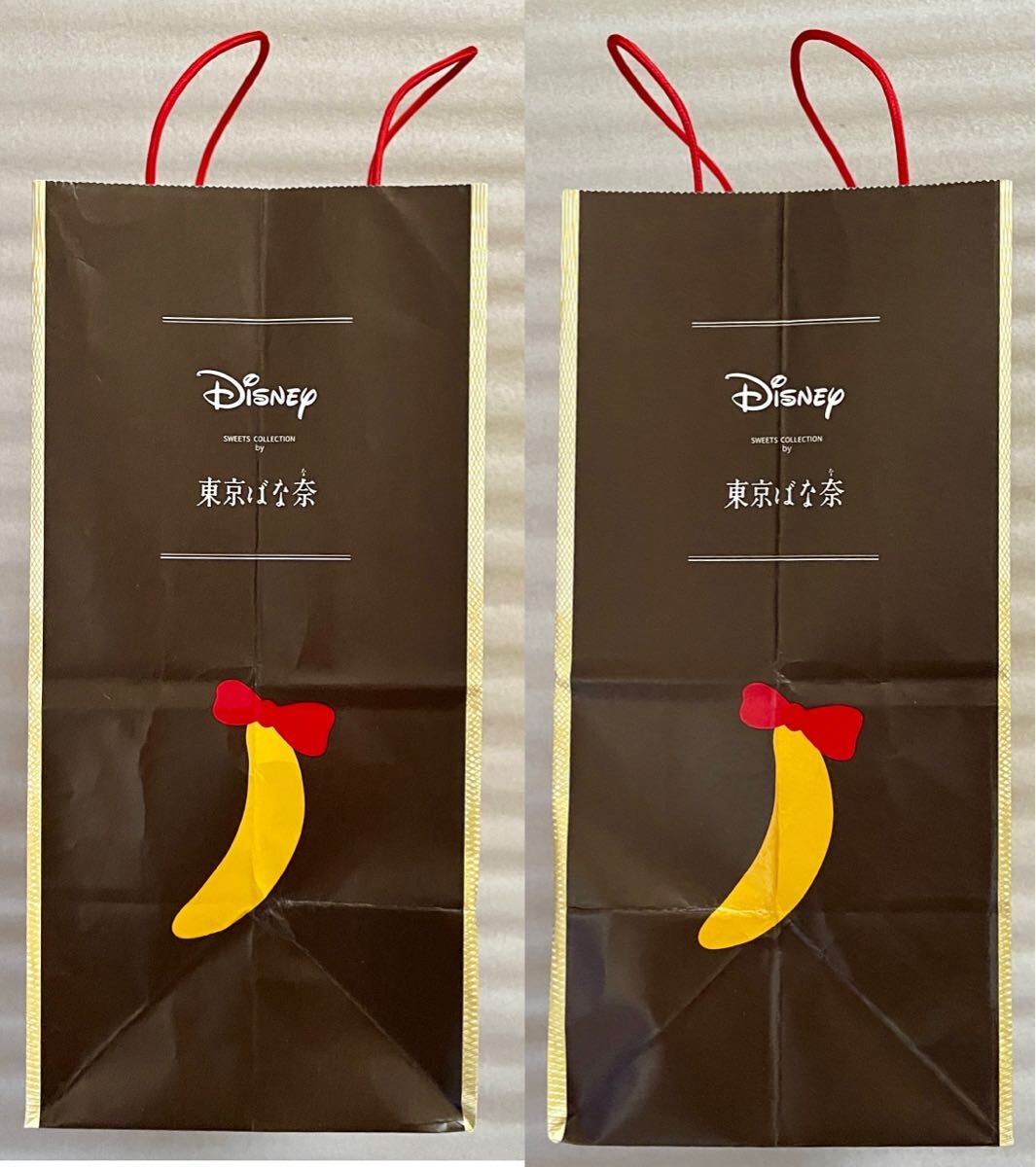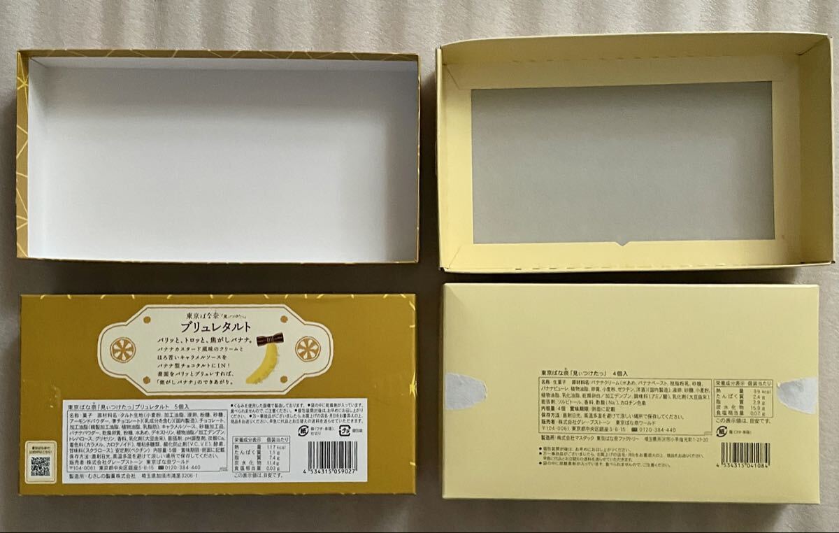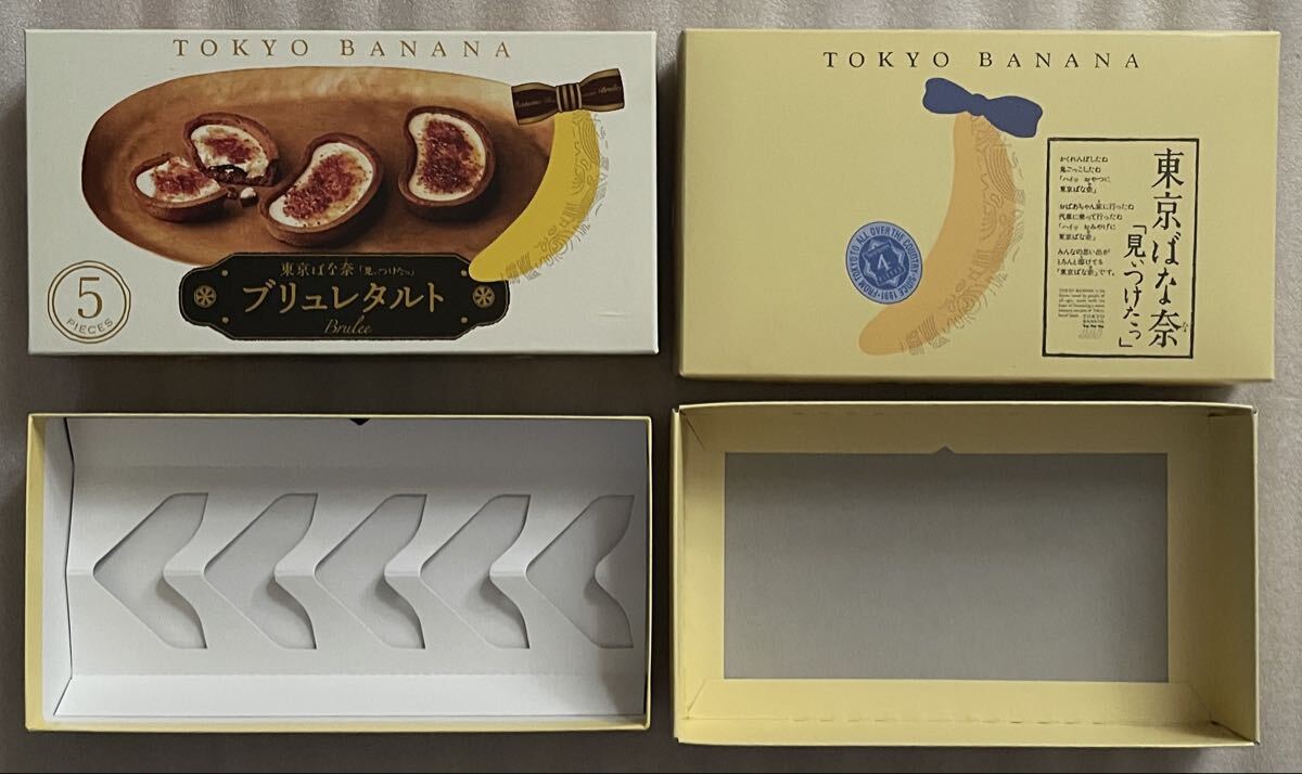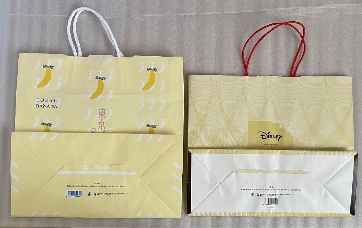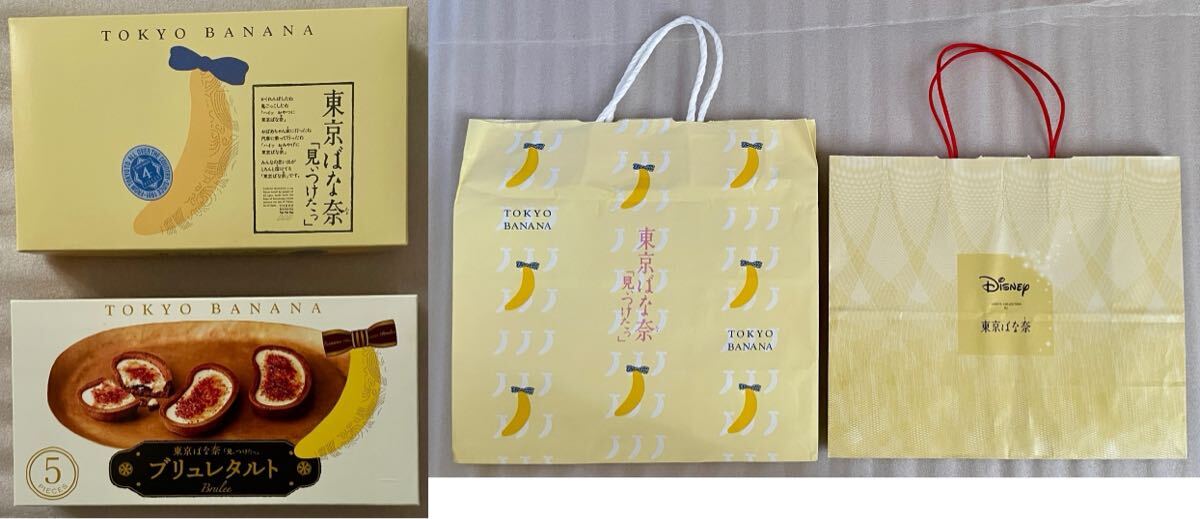 ●東京ばな奈「見ぃつけたっ」ブリュレタルトの空箱と通常の空箱の2個です。お菓子は入っておりません。ディズニーのコラボ限定紙袋と通常の東京ばな奈の紙袋2枚です。正規品です。