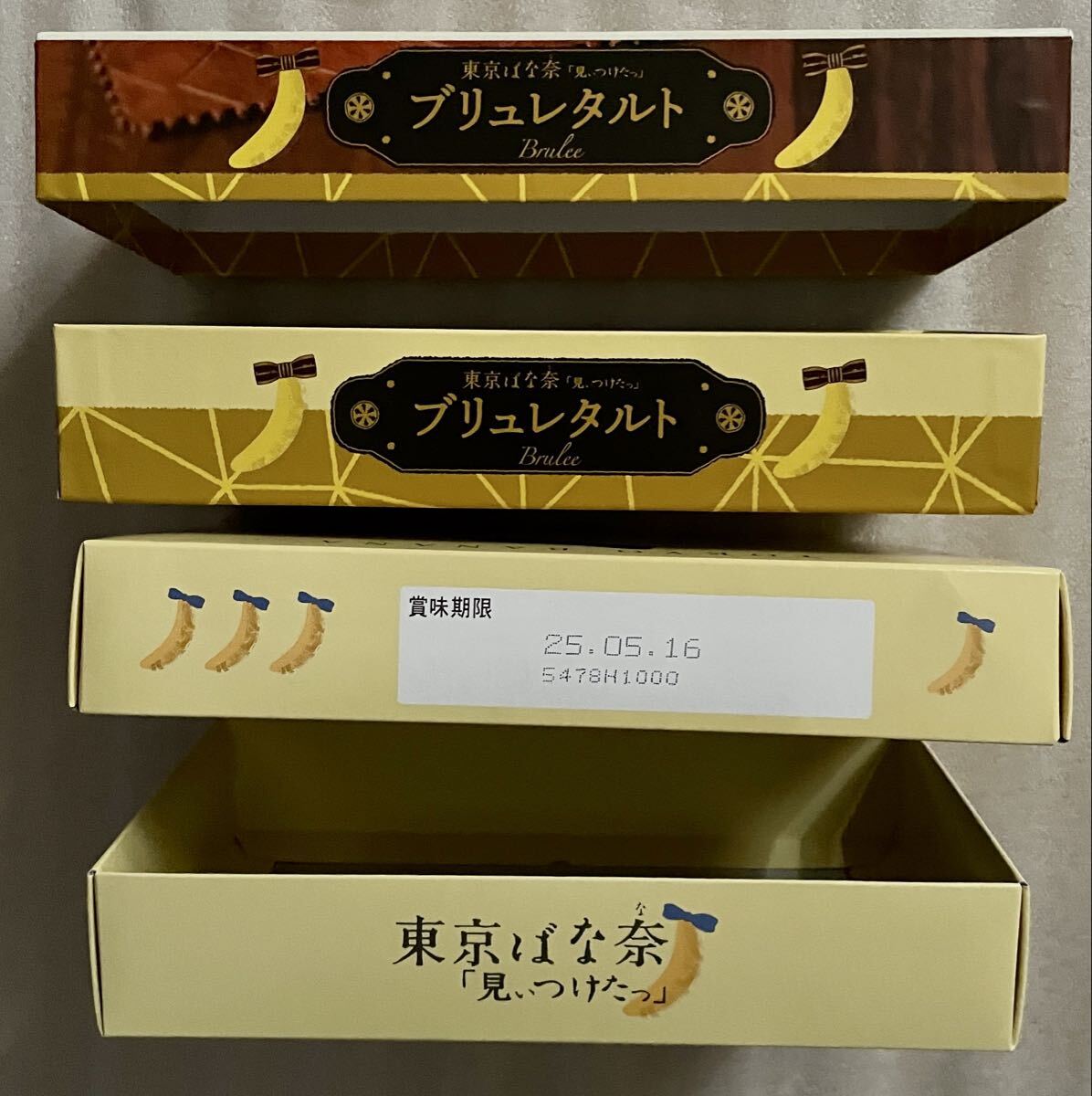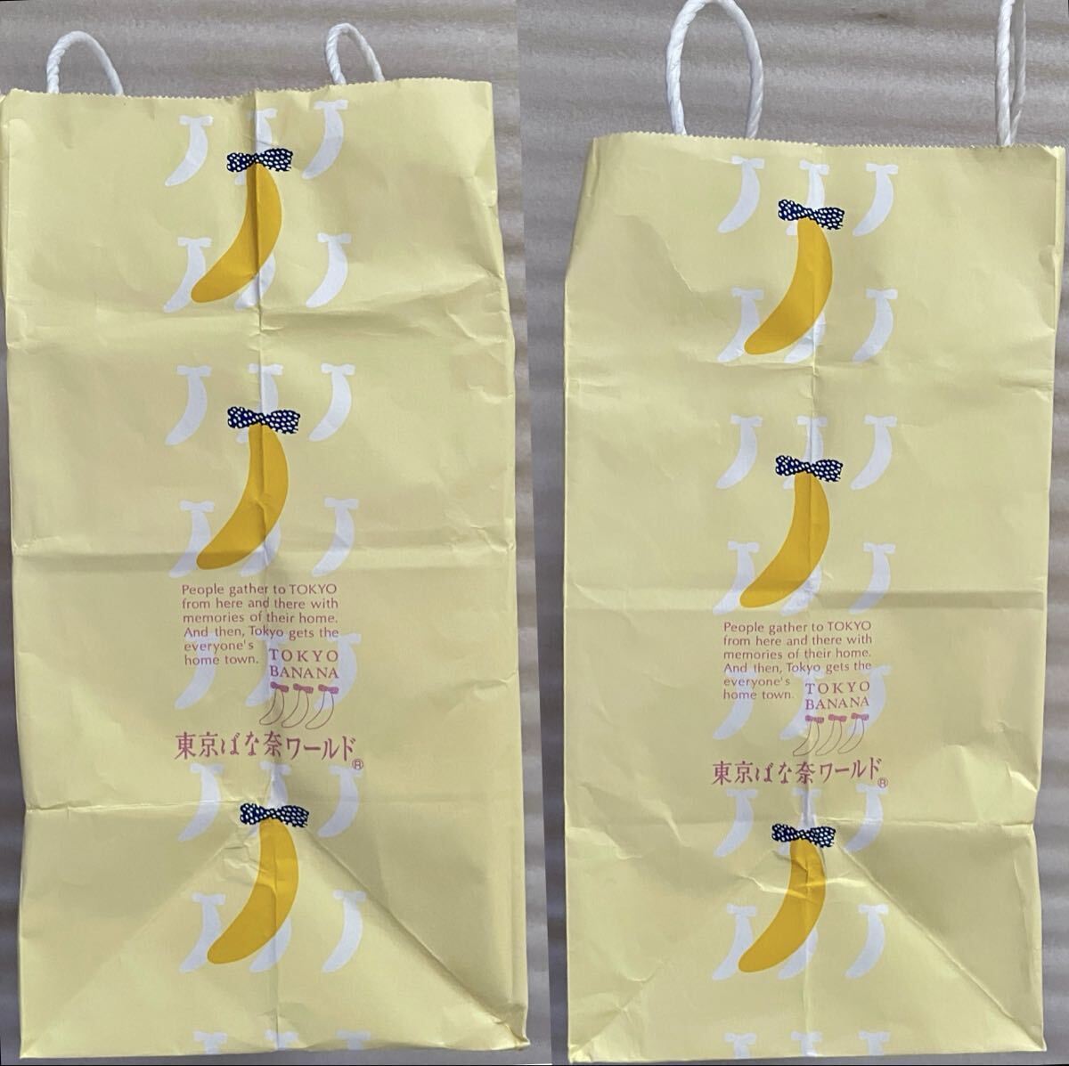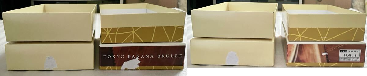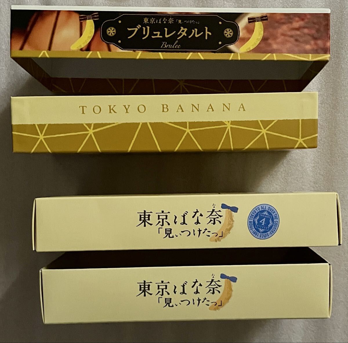 ●東京ばな奈「見ぃつけたっ」ブリュレタルトの空箱と通常の空箱の2個です。お菓子は入っておりません。ディズニーのコラボ限定紙袋と通常の東京ばな奈の紙袋2枚です。正規品です。