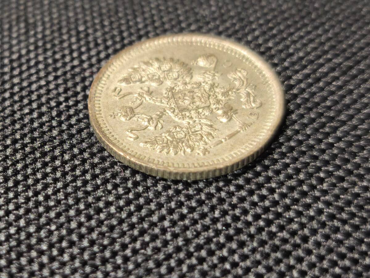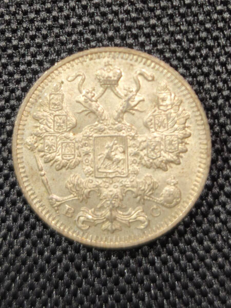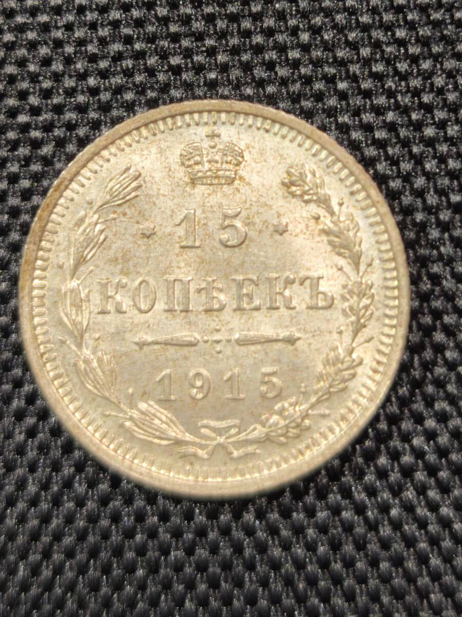 1915年に発行された「ロシア帝国」の「15コペイカ銀貨」です。 帝政ロシア、最後の皇帝「ニコライ2世」の治世下に発行された、第一次世界大戦中のコインです。