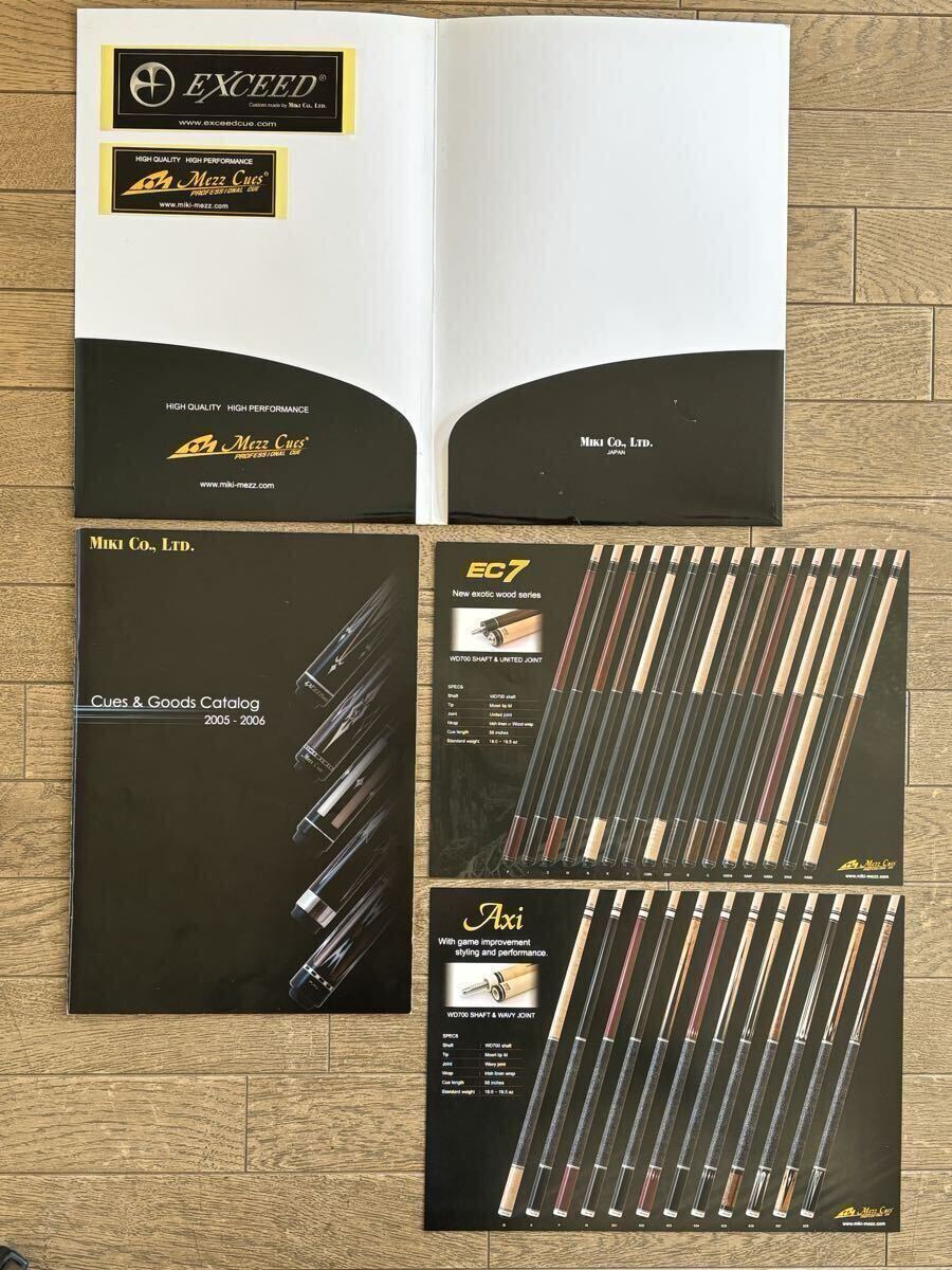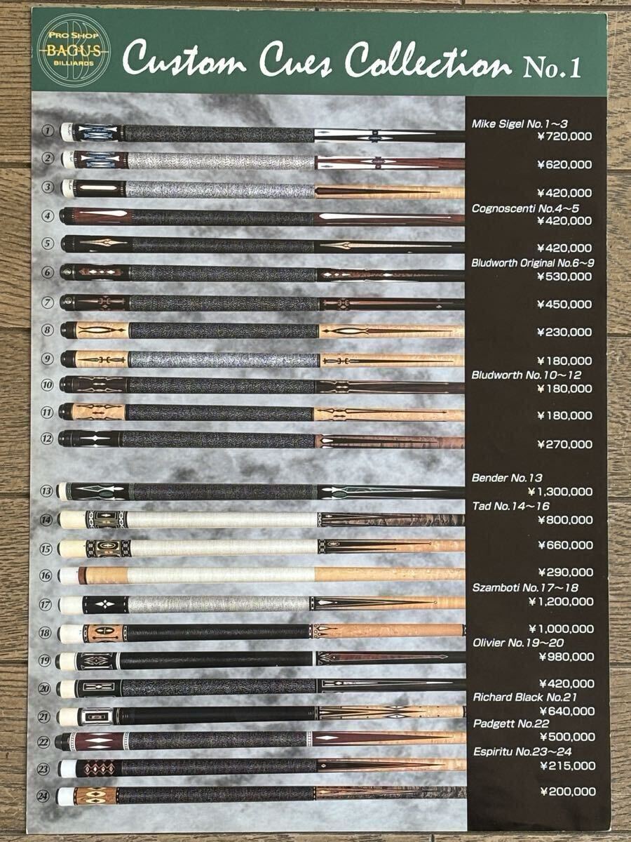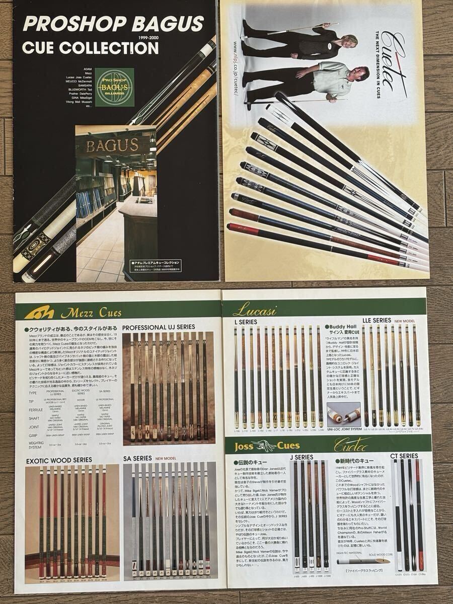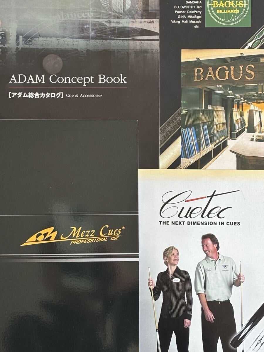 メッヅ、アダム、キューテック等。メッヅはステッカーも付属します。バグースのカタログは約25年前のもので、当時のカスタムキューが掲載されています。画像でご確認下さい。