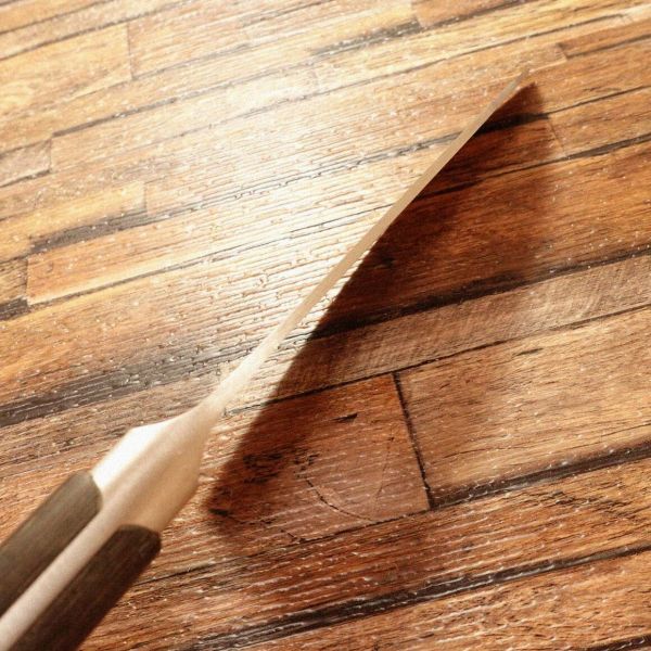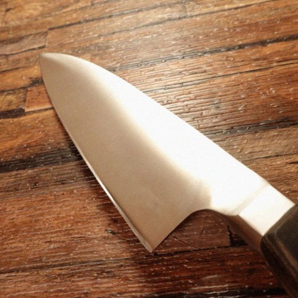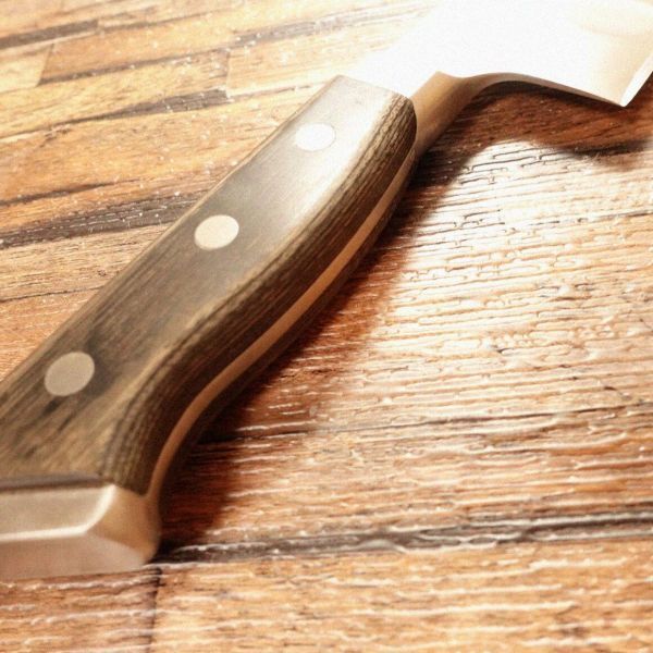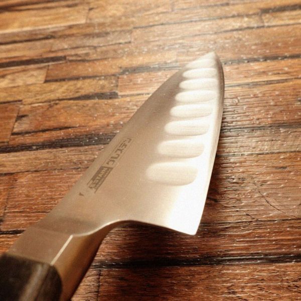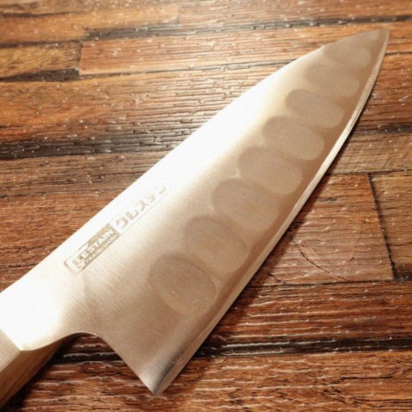 洋出刃包丁は、三徳包丁や牛刀のような汎用性を持ちながらも刃厚があり、魚の処理にも対応できる万能型の包丁です。ほとんど使われていないであろうお品です。片刃気味に研がれていましたのでそのままお仕上げしています。9:1か8:2くらいに片刃に研がれています。片面ディンプル付きのお品で、素材離れよく設計されています。