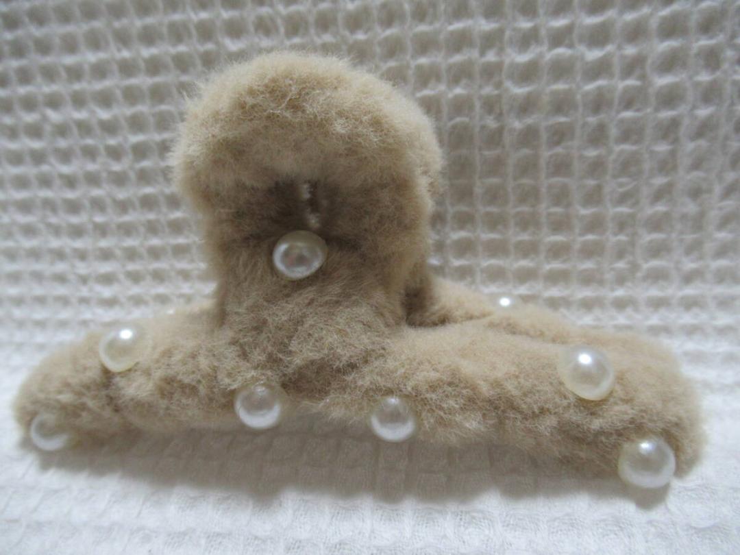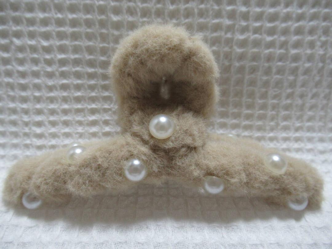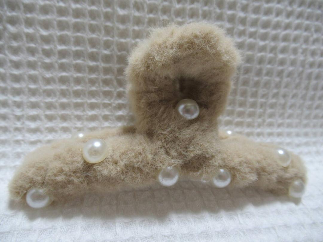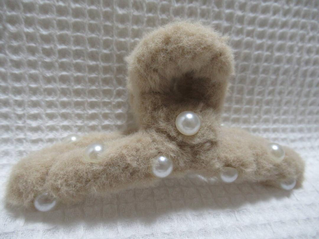 パールの半球型付きベージュ系色のフェイクファー 大き目のループ型バンスクリップ