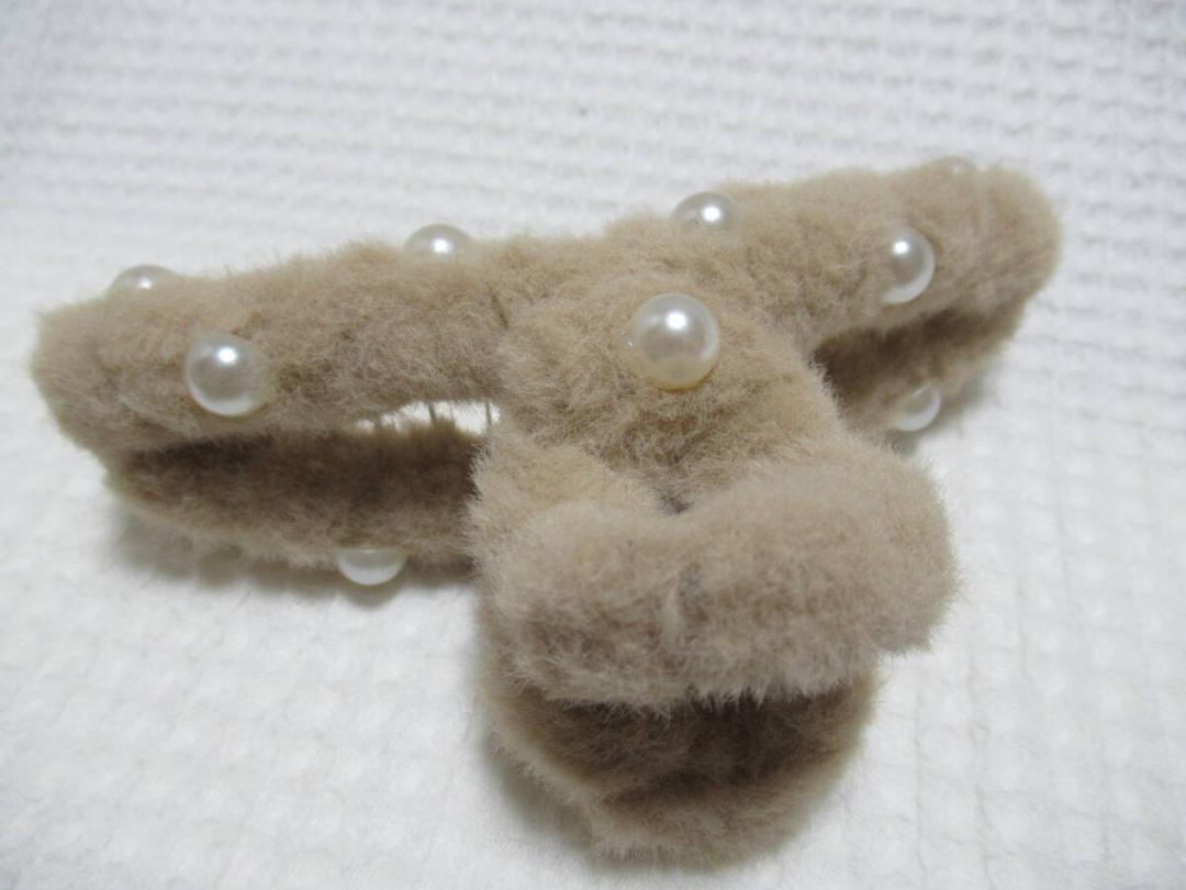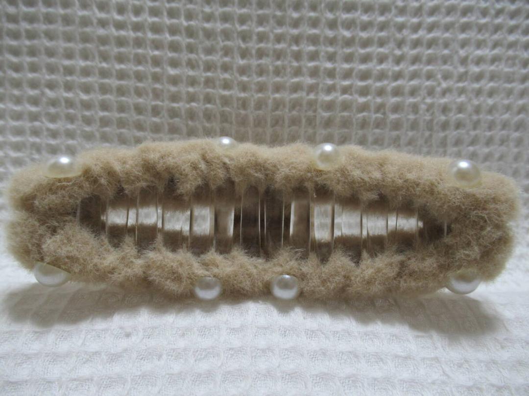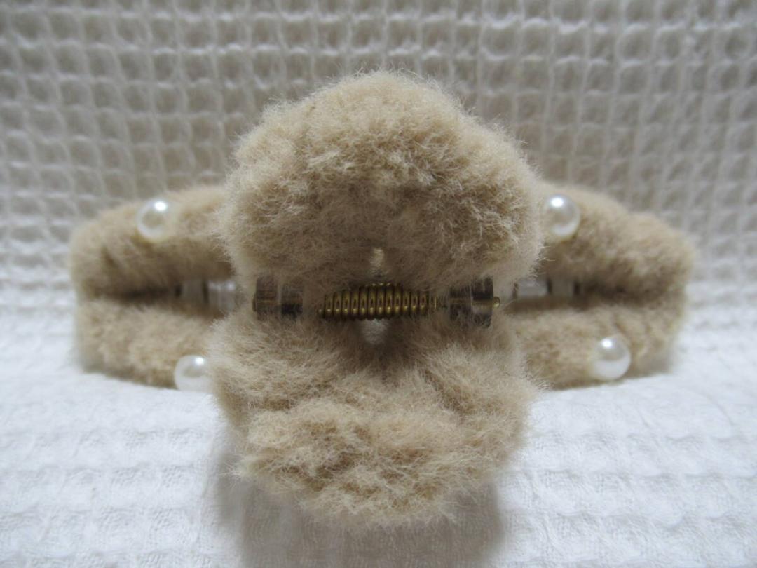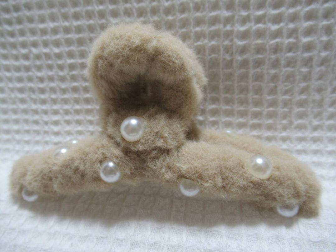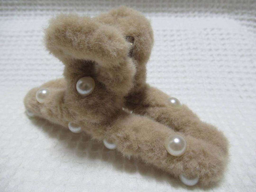 パールの半球型付きベージュ系色のフェイクファー 大き目のループ型バンスクリップ