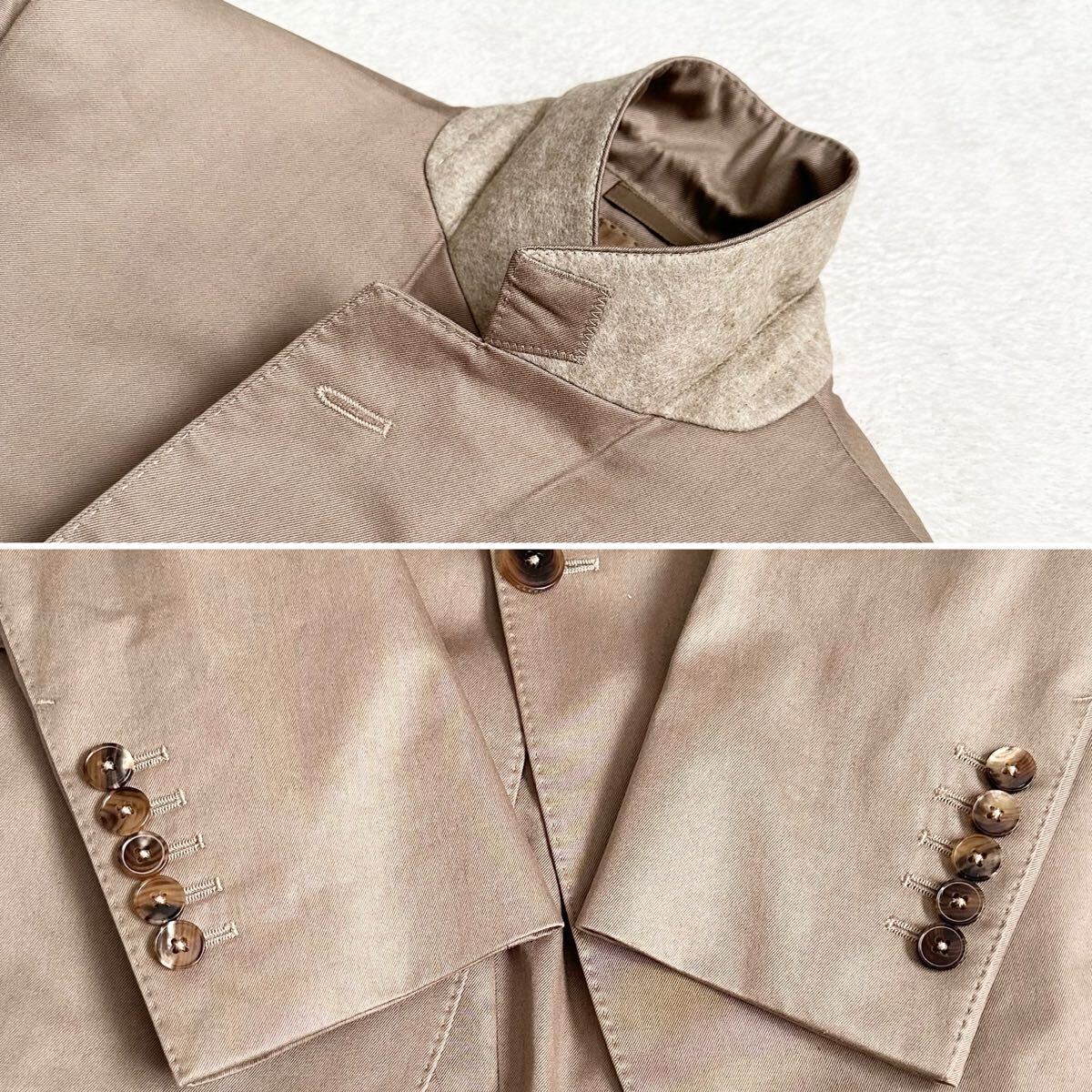 ジャケットは2ボタン・本切羽・センターベント仕様で、細部まで丁寧な縫製が施されています。