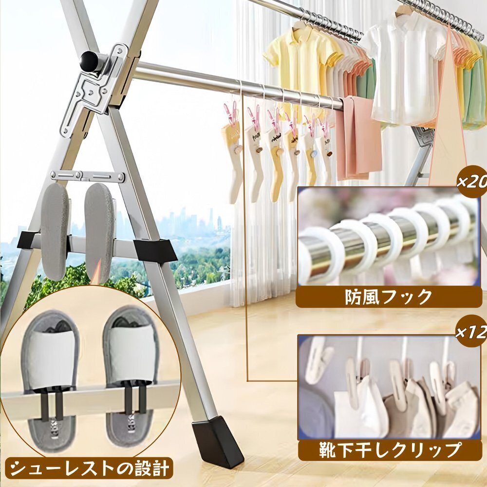 【 独特なデザイン】①部屋干しには、木製フロアを傷つけずに安定性を高める超大型の防滑フットパッドが付属しており、屋外での風に強い性能も向上しています。②洗濯干しは、使用中に手や衣類を傷つけるのを防ぐために、伸縮ポールの保護カバーが付いています。③また、物干し竿を直接ご利用いただくために、12個のクリップと20個の風防フックが付属しています。