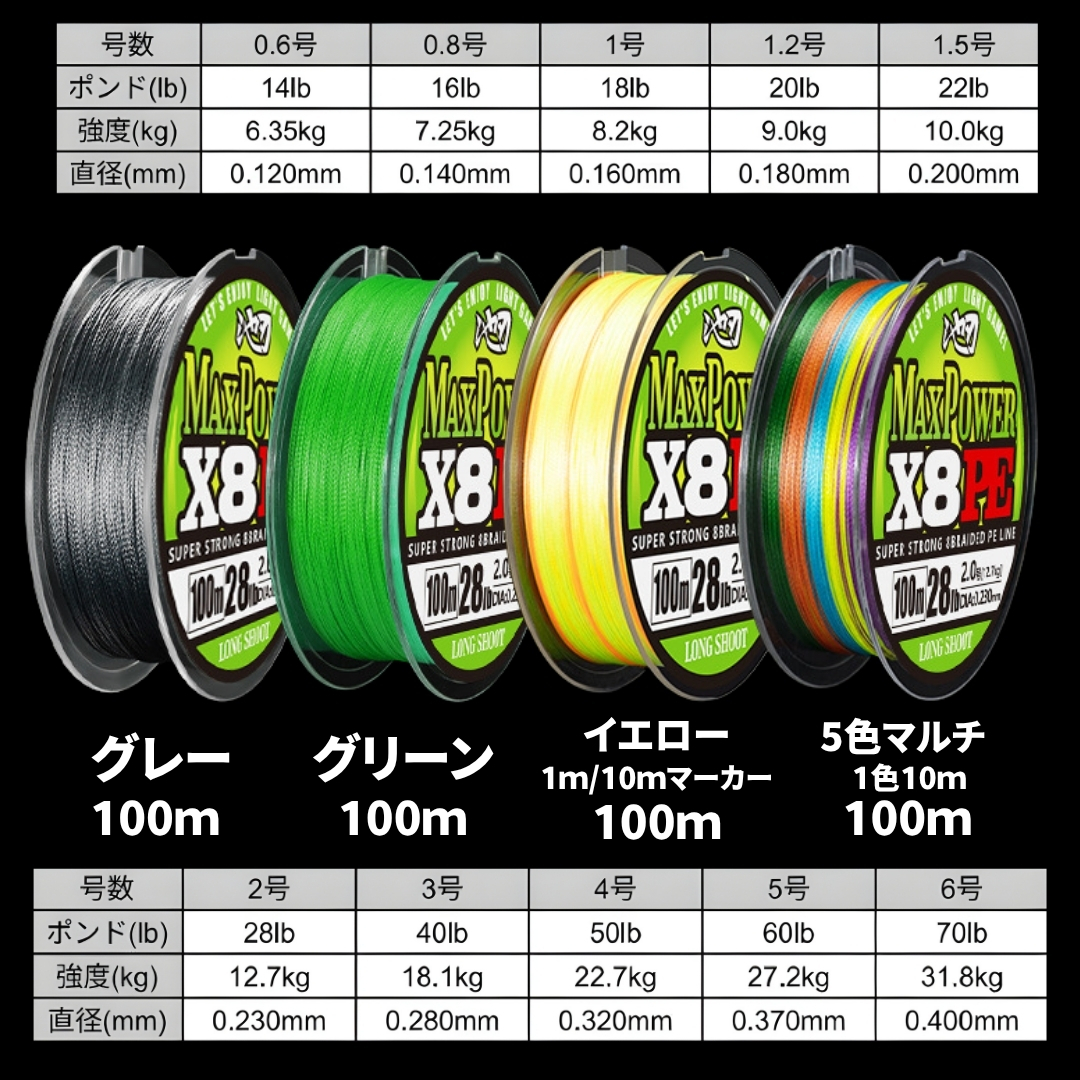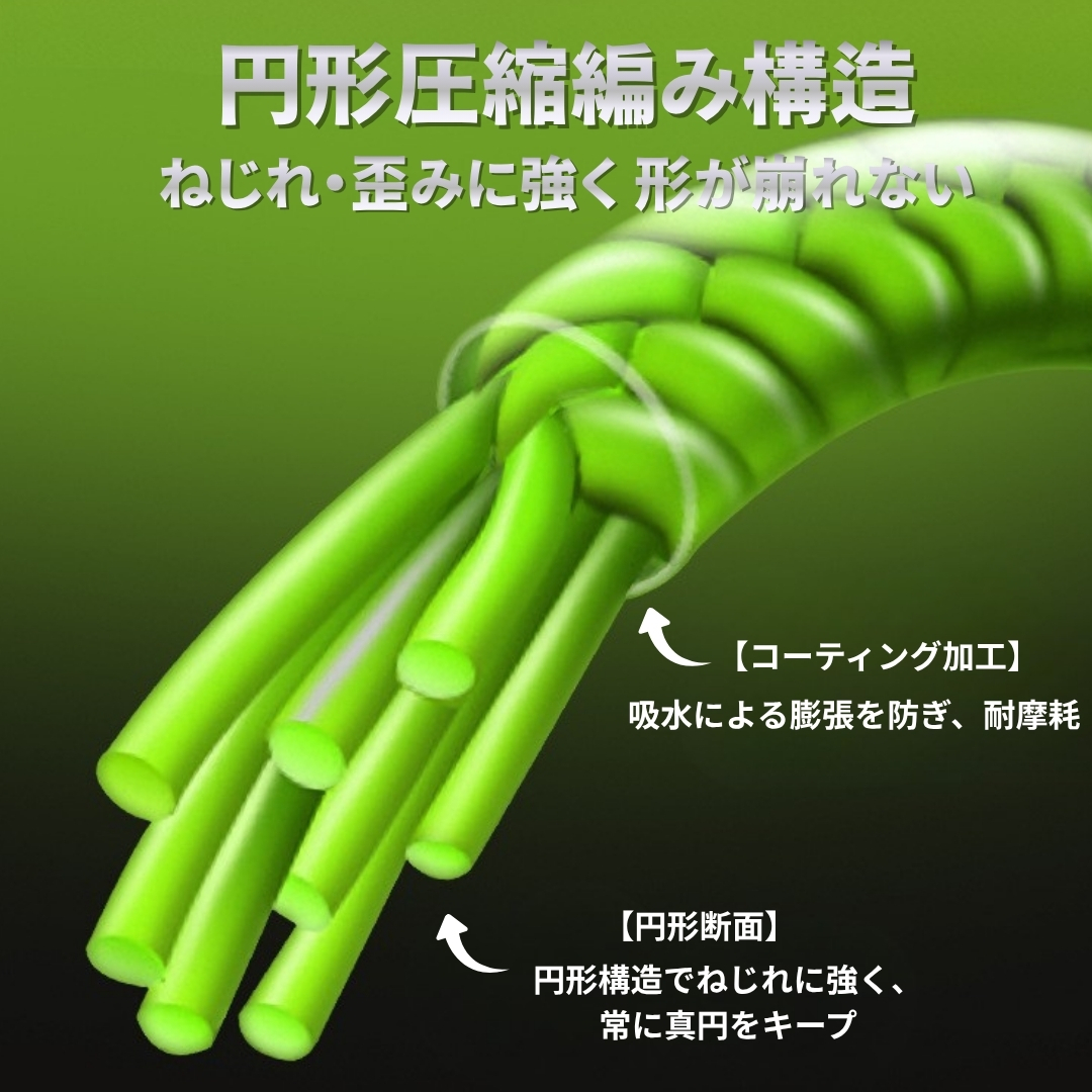 | イエロー(10mごとに1mのオレンジマーカー) | 視認性抜群、キャスト距離の確認に便利 |