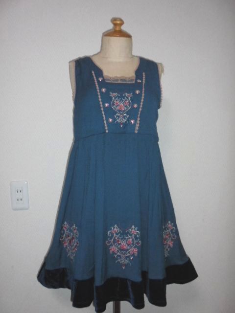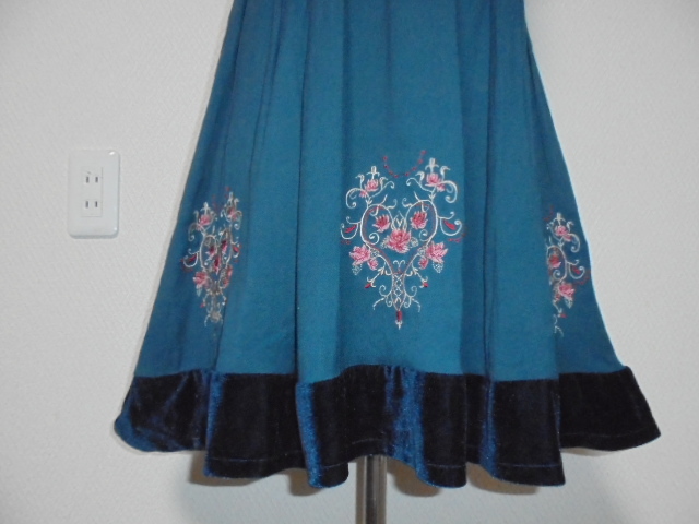axes femmeグリーンブルー色胸当て裾バラ刺繍胸元ボタンモチーフW裾ベロア切替OP