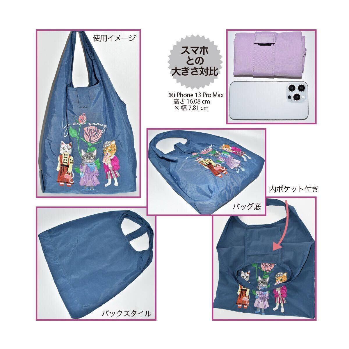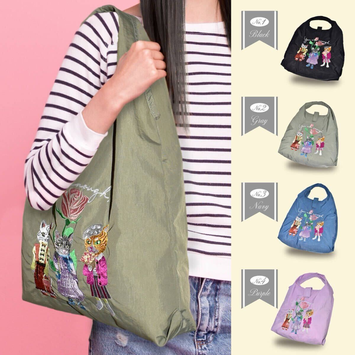 高級感のある色鮮やかな猫の刺繍のエコバッグです。