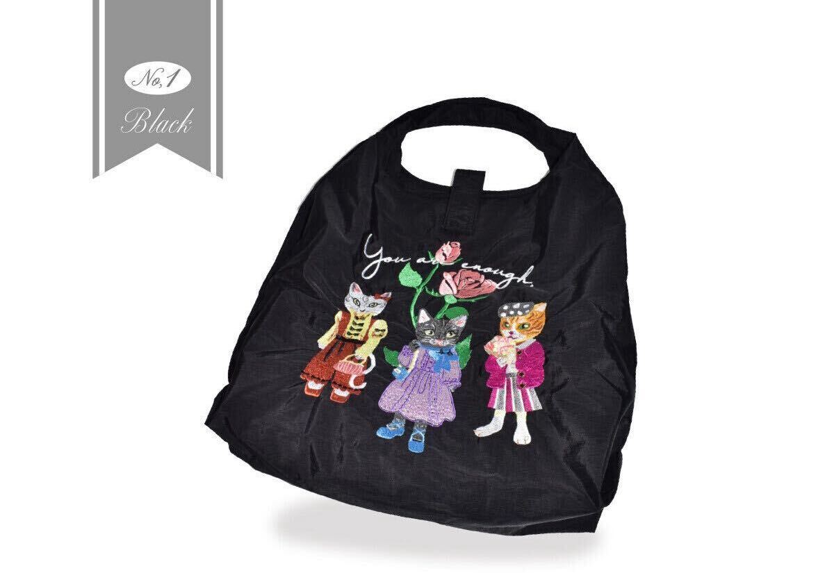 ネコの刺繍エコバッグ♪折りたたみ ブラック Mサイズ ナイロン かわいい猫の刺しゅう