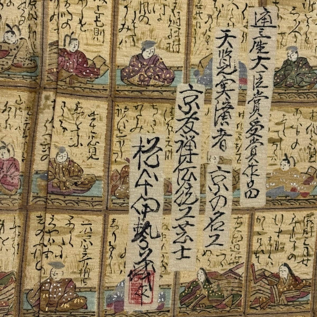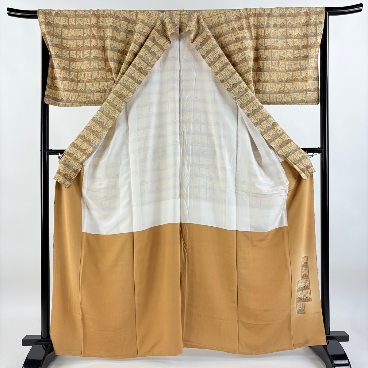 | 小紋 美品 名品 樽本伊勢蔵 落款 百人一首 人物 金銀彩 ベージュ 袷 身丈165 裄丈65.5 M 正絹 【中古】 |