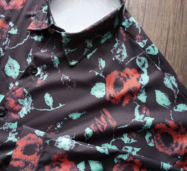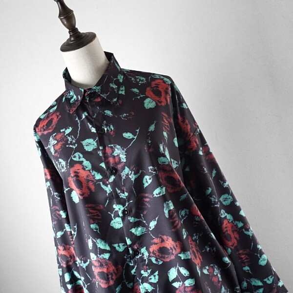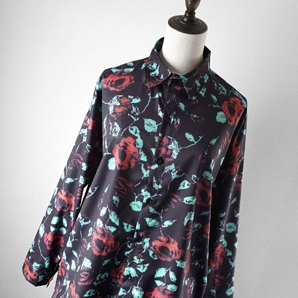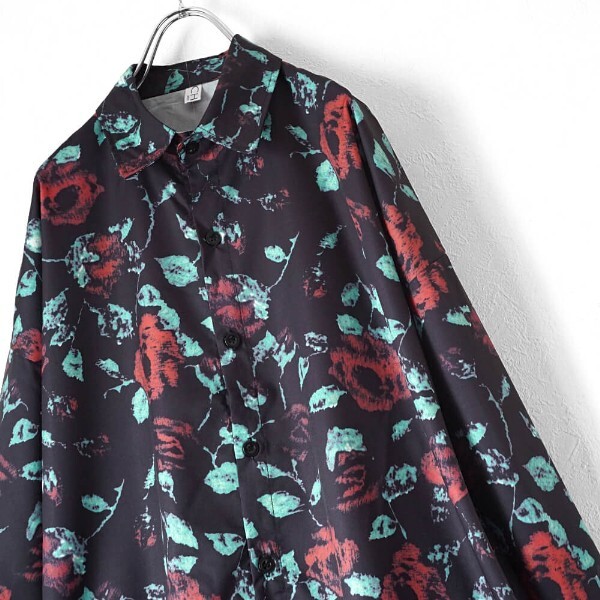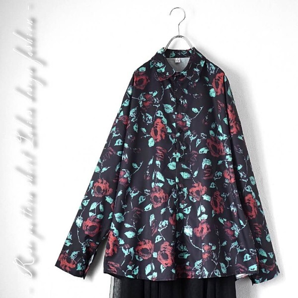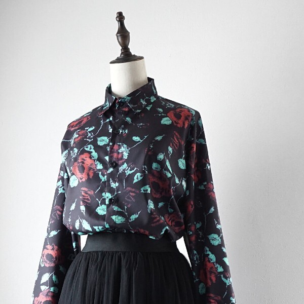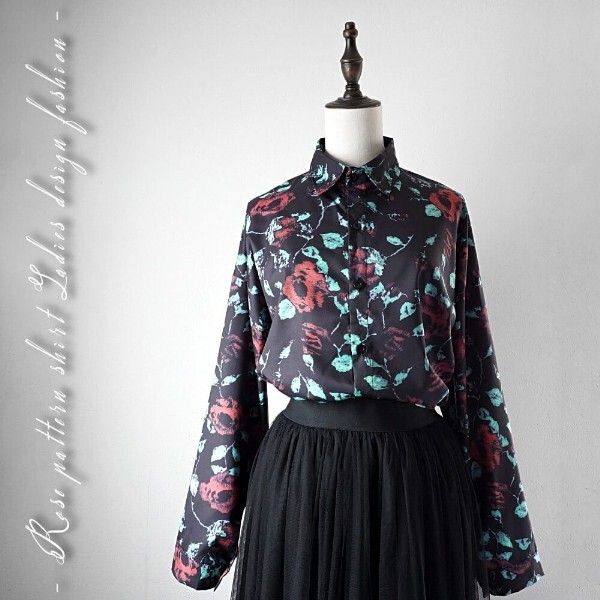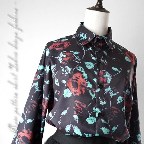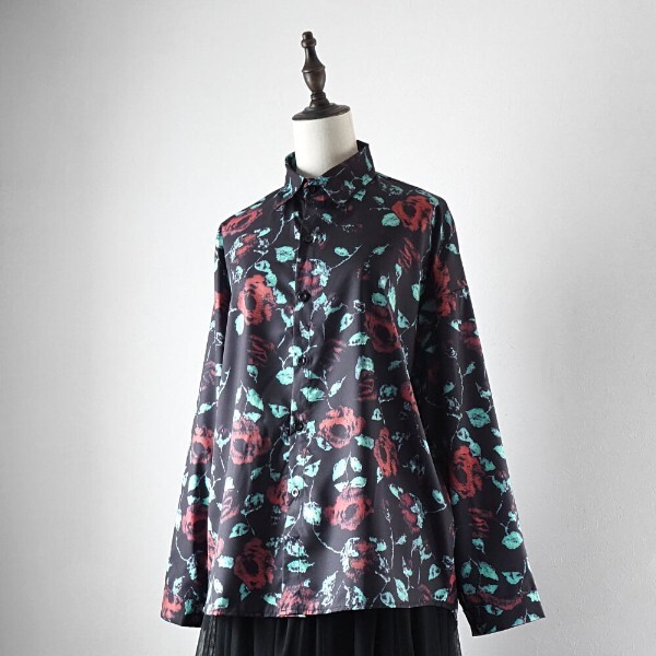 【毎日当日発送】 ブラックベース レトロアートなバラ柄 シャツ 長袖 花柄 総柄 ボタニカル柄 薔薇柄 ヴィンテージ風 黒 トップス ブラウス