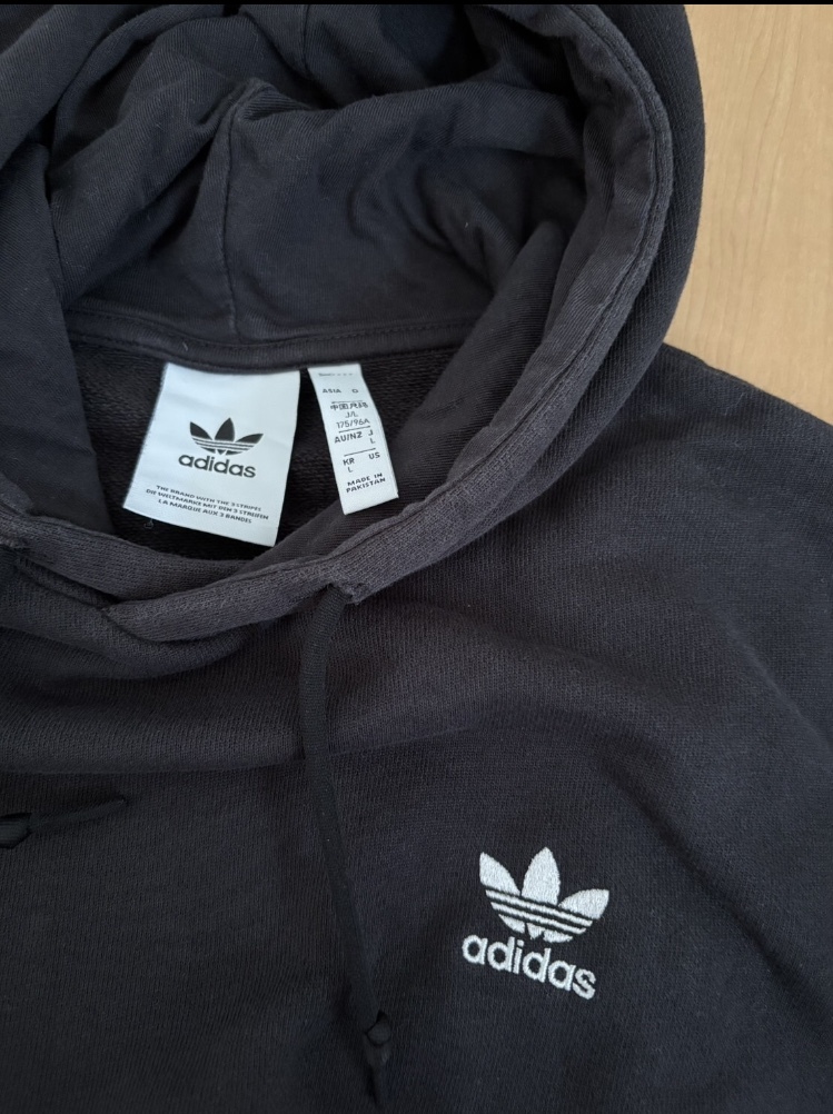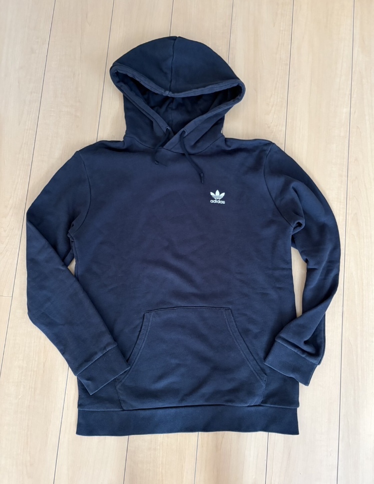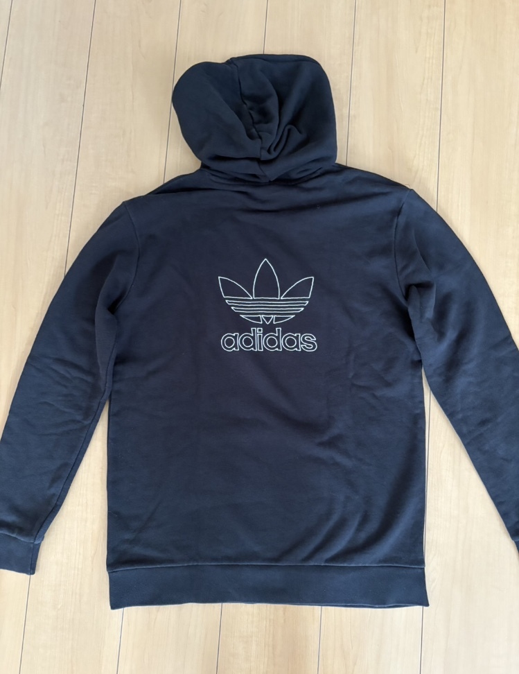 3,4年前にアディダスショップにて購入しましたが、最近出番がないので出品致しました。アディダスのブラックのパーカーです。大事にしておりましたが、通常使用にて首回り、フード周り、手首回り、裾周りなどのふち部分に色あせ感がございます。画像にてご確認ください。サイズですが、着丈(首の後ろから真下に向かって、約67㎝)身幅(わきの下少し下部分に左右間、約52㎝)です。通常のメンズのLサイズより細身に感じます。購入価格は1万円位だったかと思います。発送は静岡発ゆうぱっく60サイズにてお送り致します。是非ご検討下さいませ。