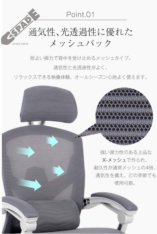 • 1.【通気性に優れたプロ仕様の競技用メッシュ素材】暑い日でも蒸れずに快適に使用できるオフィスチェア。