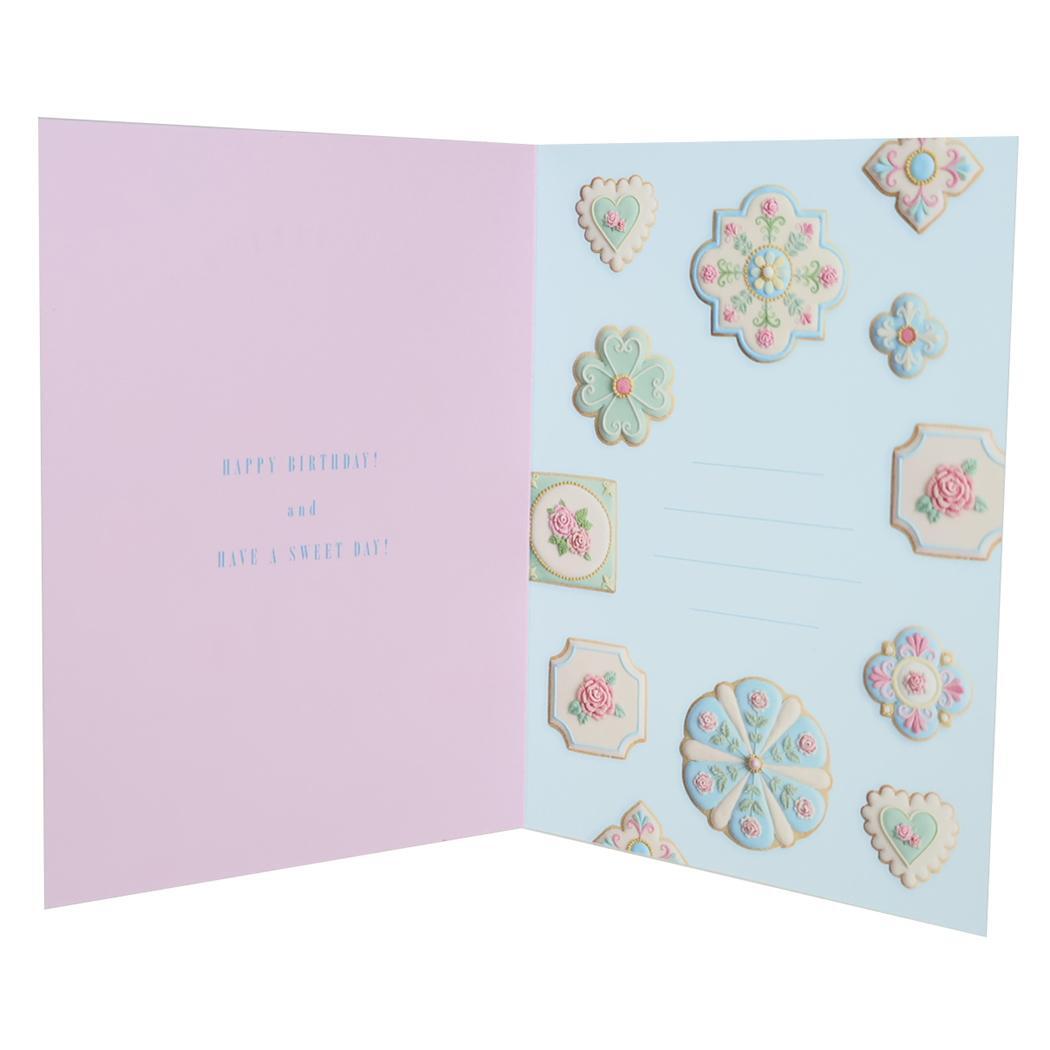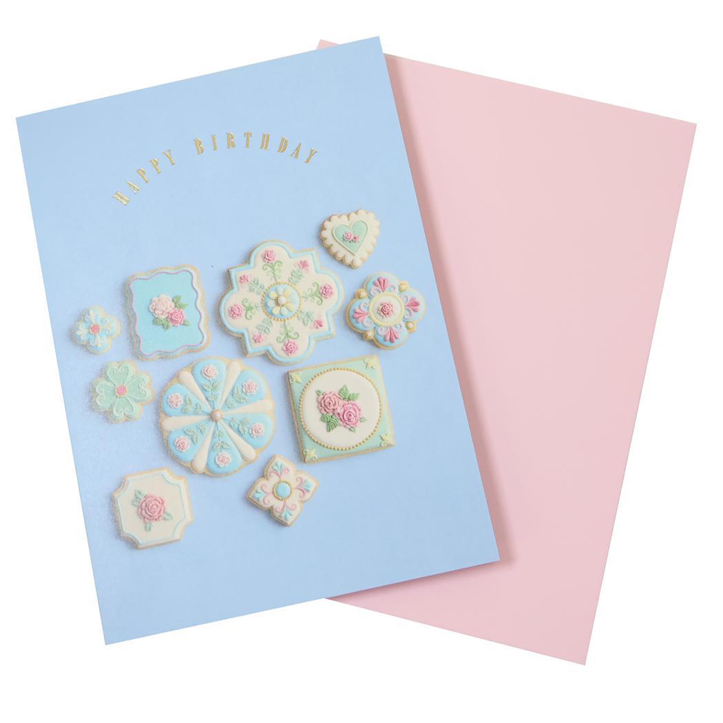 お花をテーマにしたクッキーのデザインを楽しめるシリーズ 人気のスイーツアーティストKUNIKAさんとのコラボレーション雑貨が登場アイシングクッキーの美しいデザインと世界観を感じられる、お花をテーマにしたシリーズですこちらはかわいい[バースデーカード]美しいアイシングクッキーがメッセージをより華やかに見せてくれそうなバースデーカード。表面にはHAPPY BIRTHDAYの文字が金箔押しで施されています。同シリーズの文具いろいろあるのでお気に入りを揃えてくださいサイズ:約145x105mm(封筒)/約100x140mm(カード)[Made in Japan]