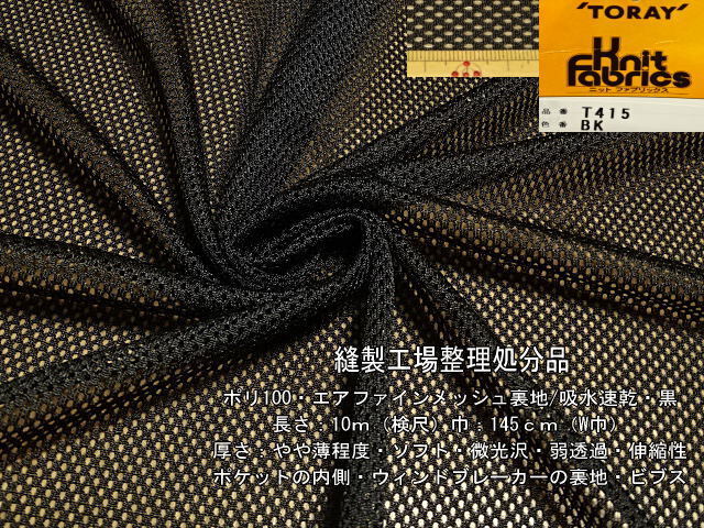 ポリ100 エアファインメッシュ裏地 吸水速乾 やや薄ソフト 黒10m | |