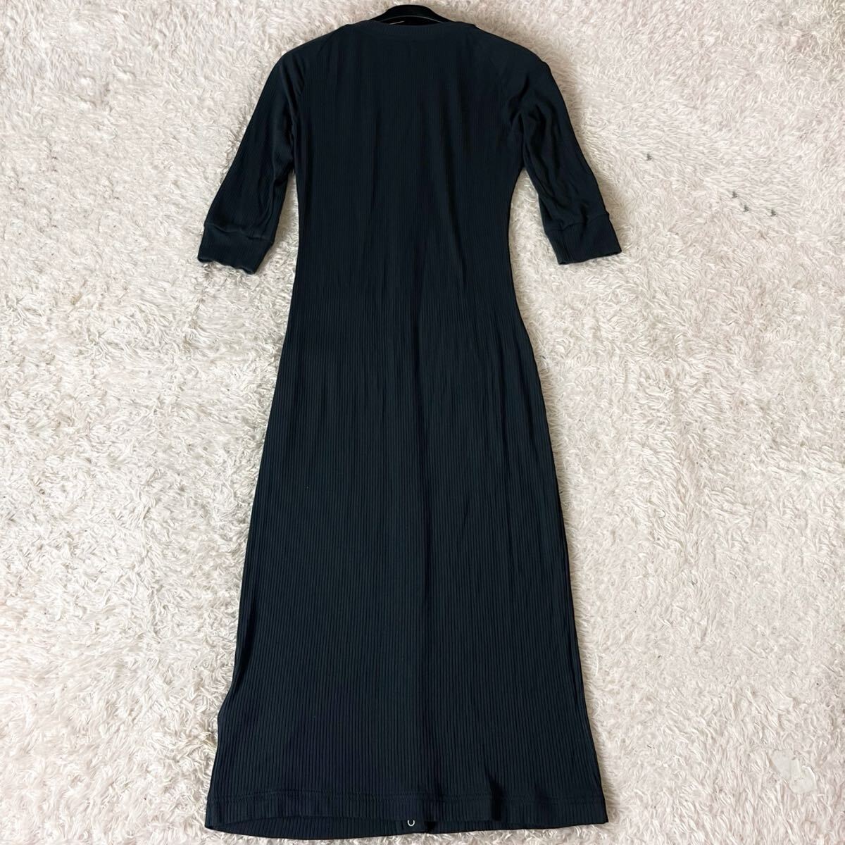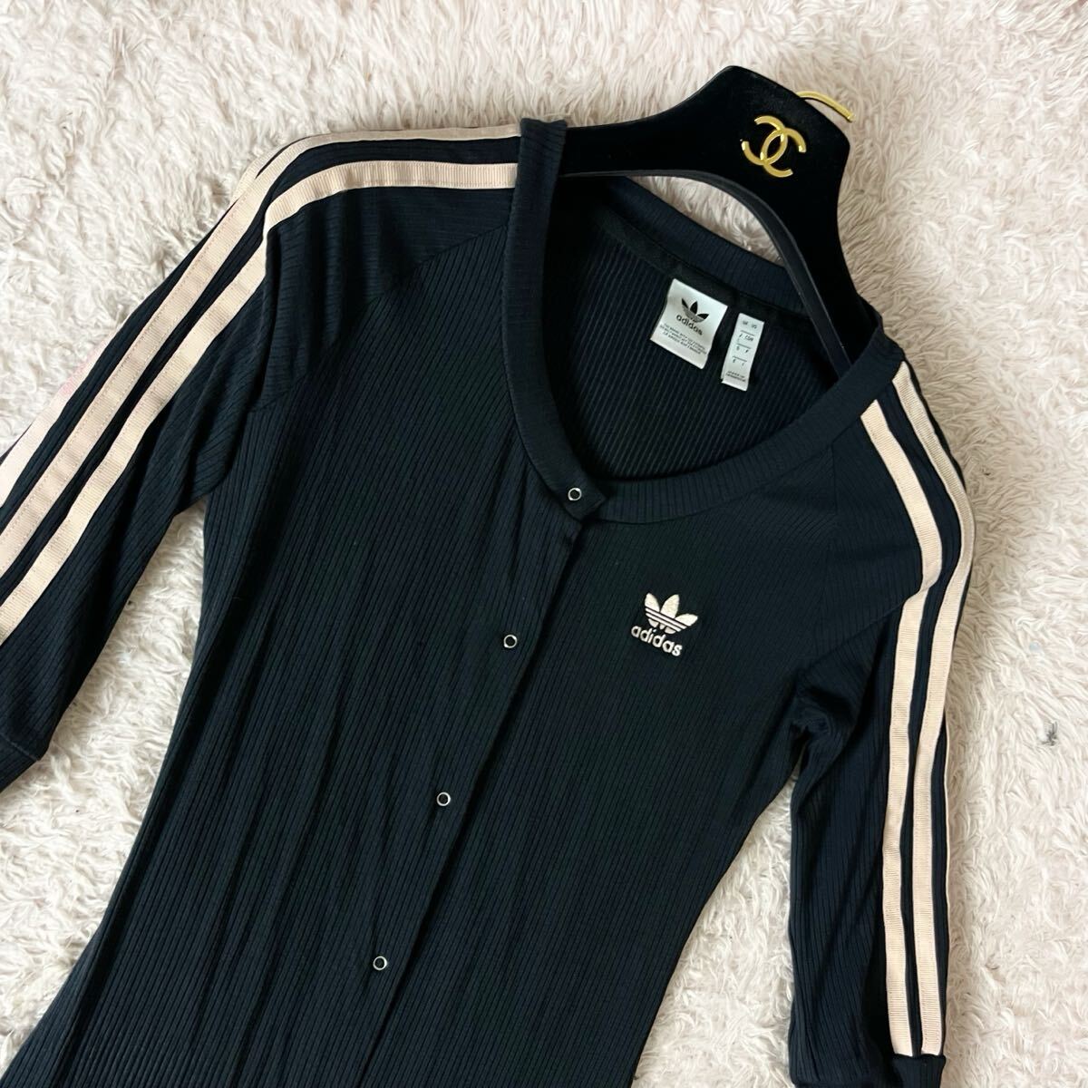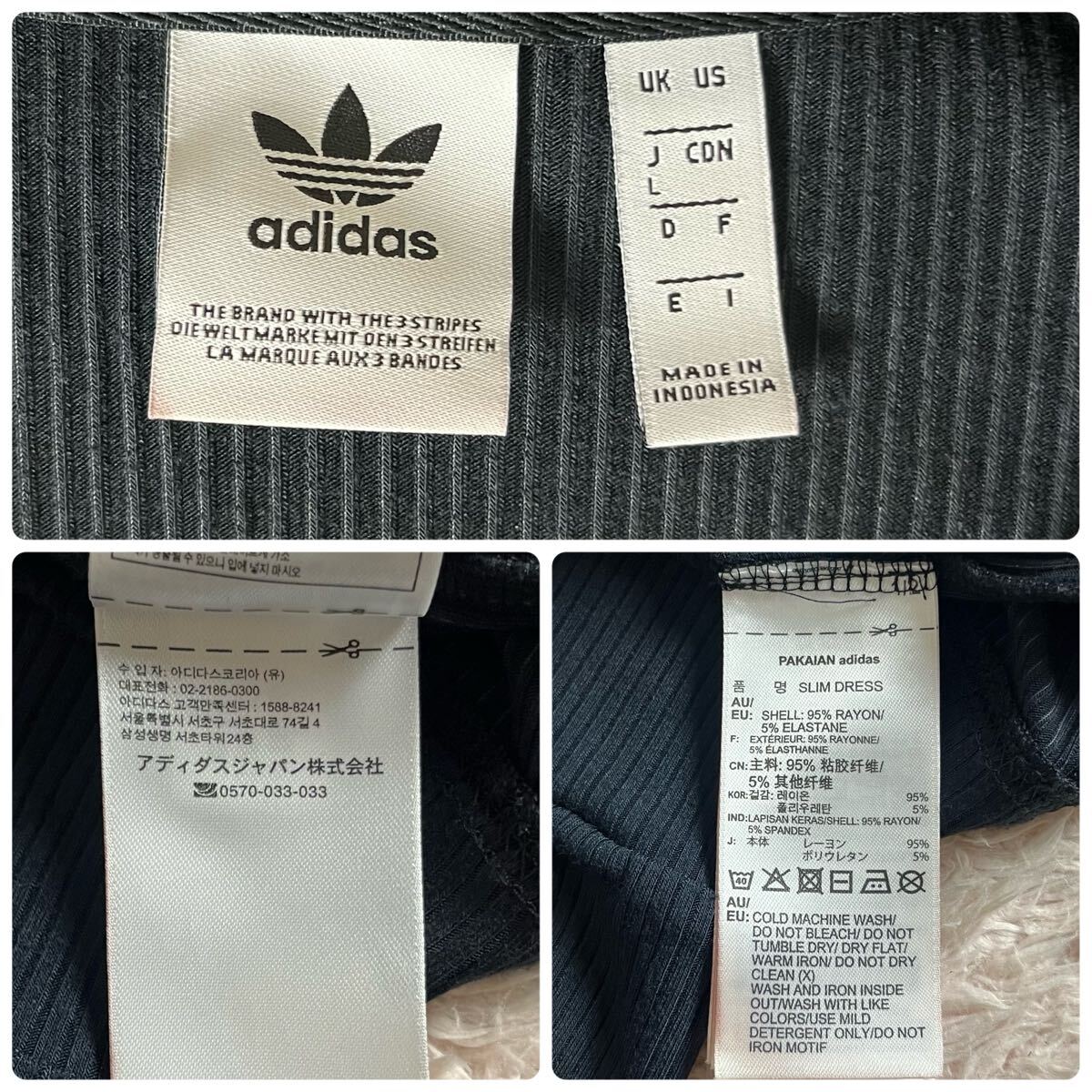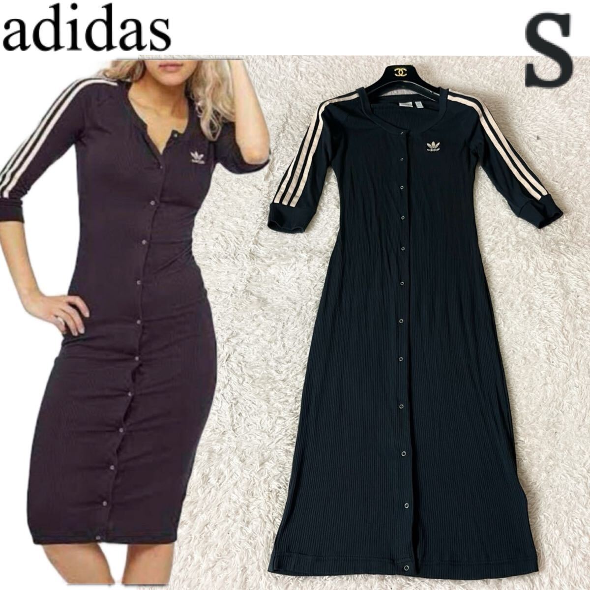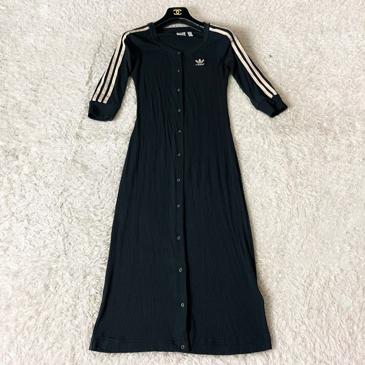 adidas アディダス ロングワンピース リブニットワンピース コットン タイト ブランドロゴ刺繍 ワンポイント 3本ライン ブラック 黒 S
